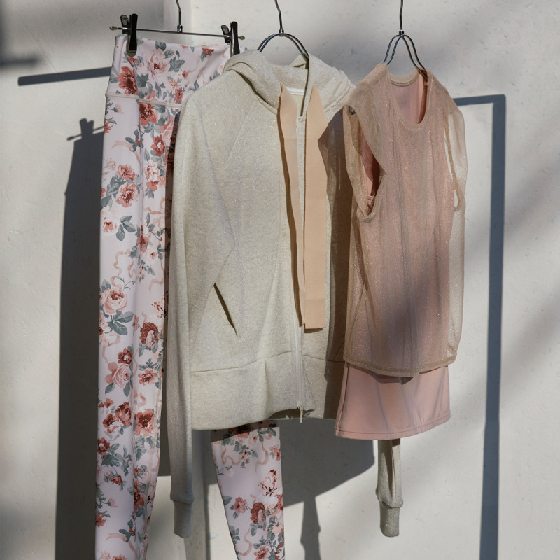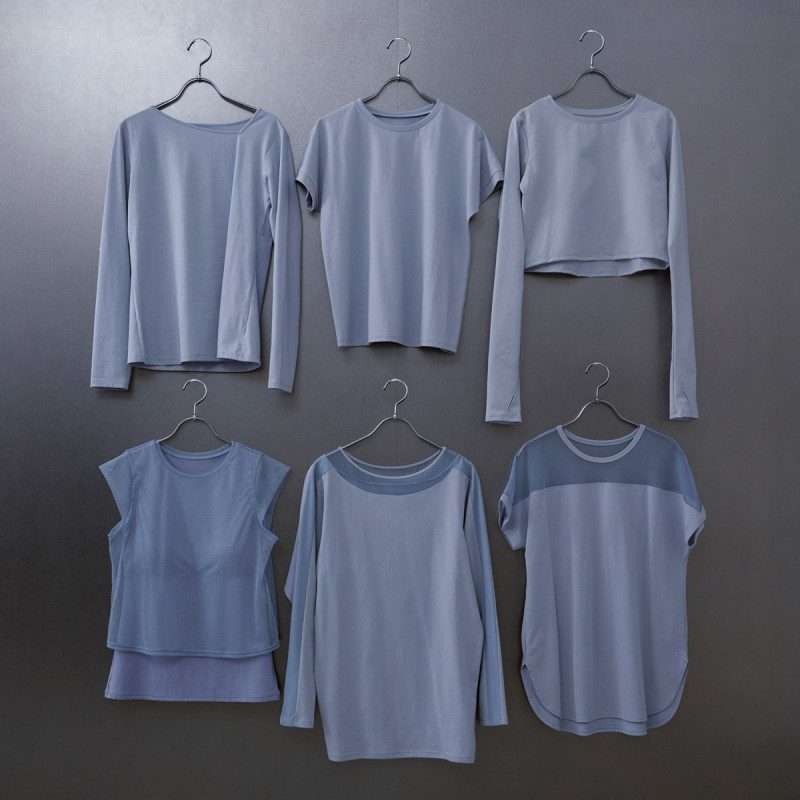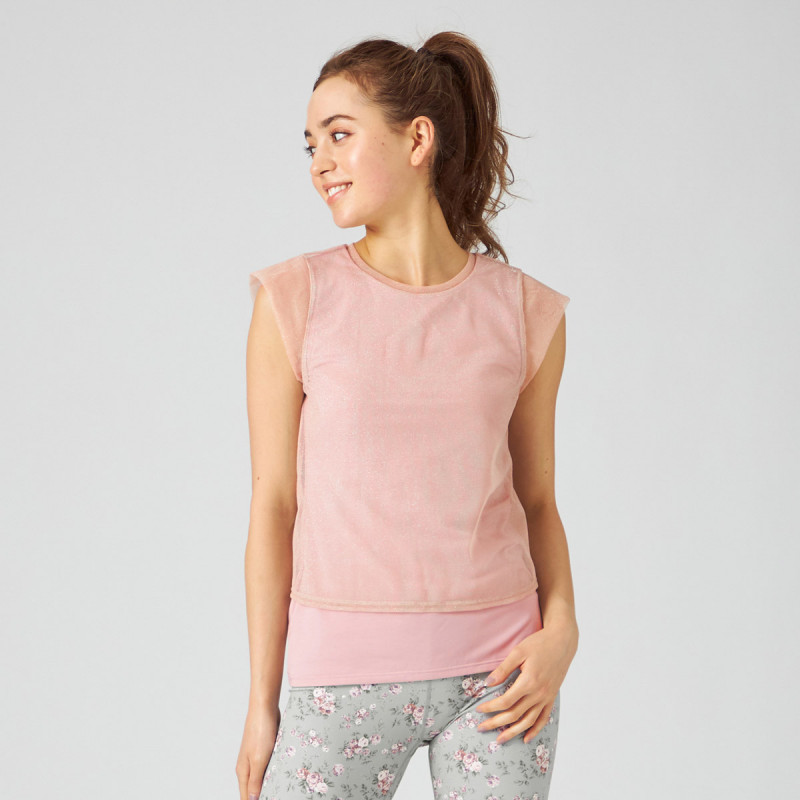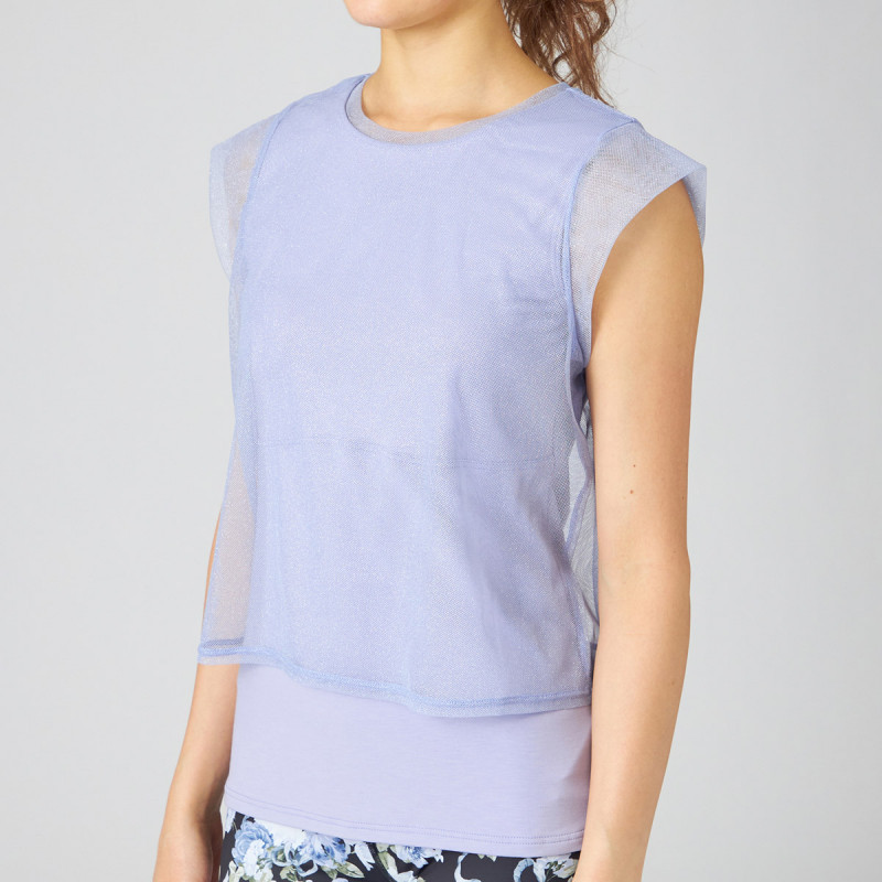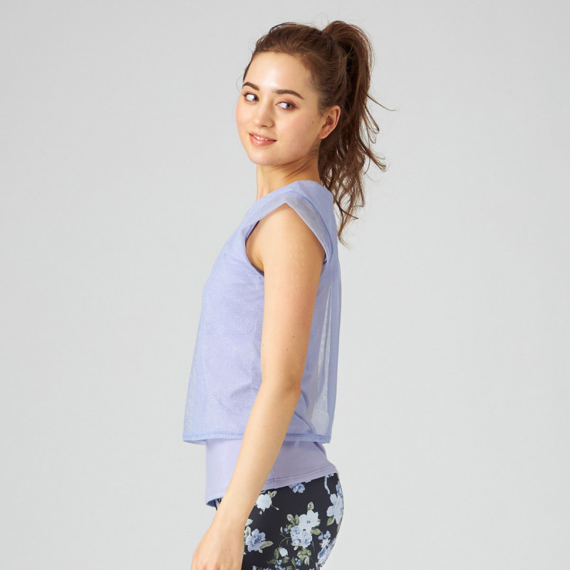 上にレイヤードしたシアーTシャツは、ラメのストレッチチュールを使用しきらきらと華やかな印象に。
