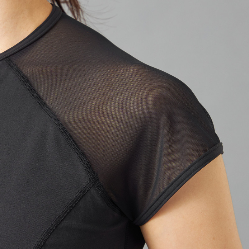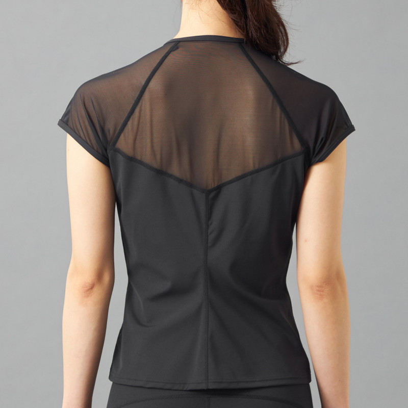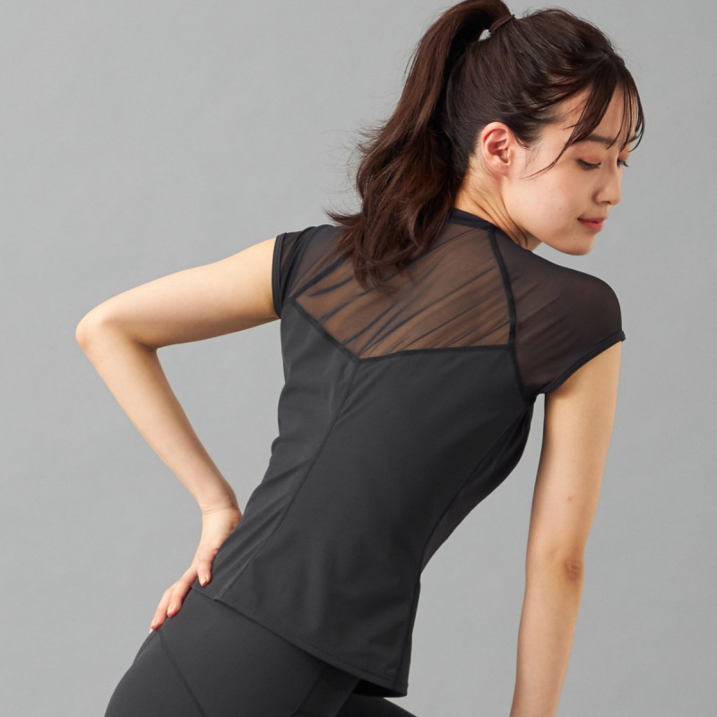 汗をかきやすいバスト部分の肌側には吸水速乾生地を使用、背中に内蔵されたパワーネットクロス構造で胸を開き、肩甲骨を意識して正しい姿勢へアプローチ。