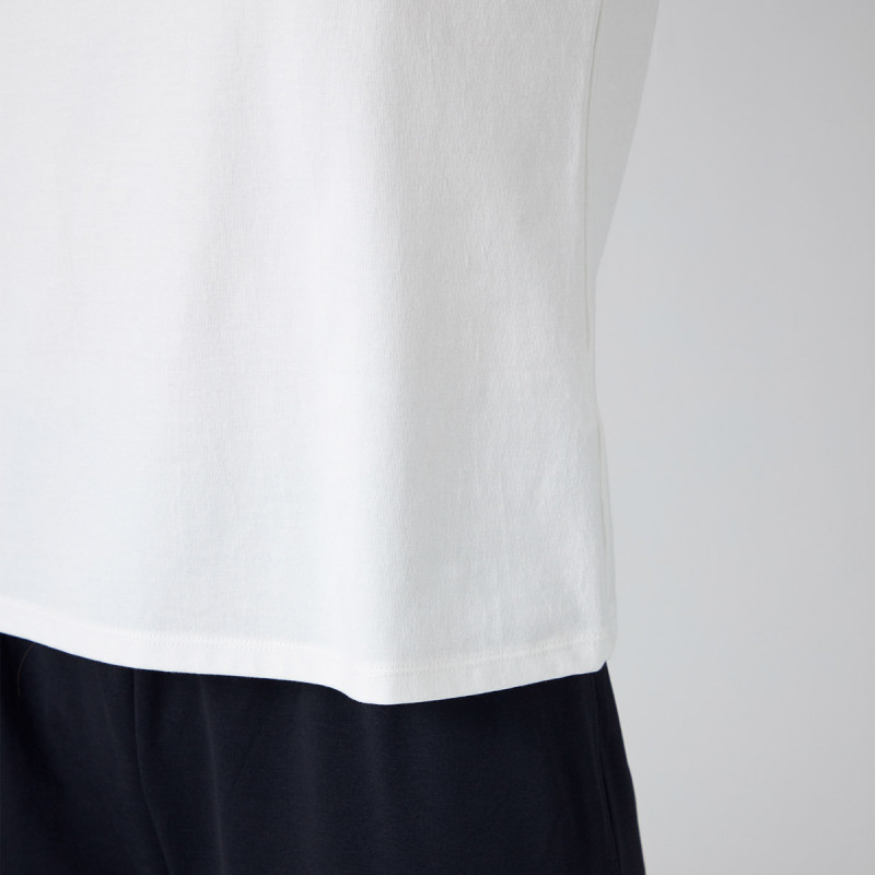 表面感が滑らかなコットンとトウモロコシ由来樹脂を含むポリエステルのハイブリッド素材を使用したシンプルTシャツ。