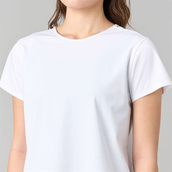 伸縮性にも優れたSORONA(R)というポリエステルを使用し、ストレッチ性があり生地の表面をきれいに仕上げた滑らかな肌触りのプレーティング天竺。