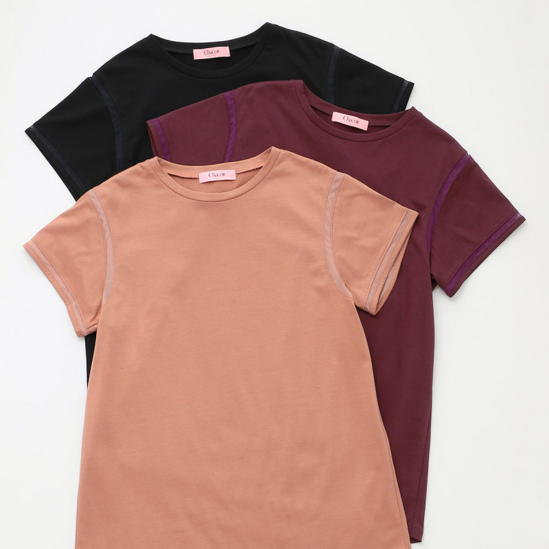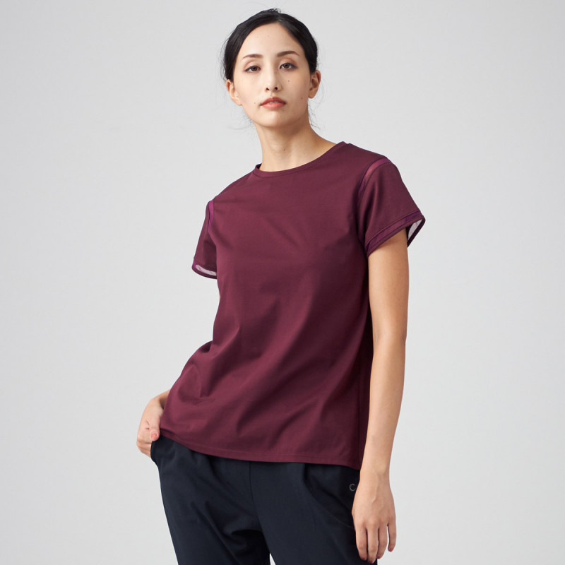 フラットな印象のTシャツ生地にシアー素材を使用して、スッキリとスタイリッシュに。
