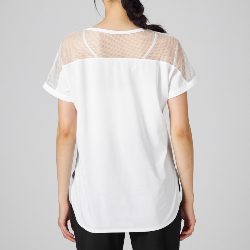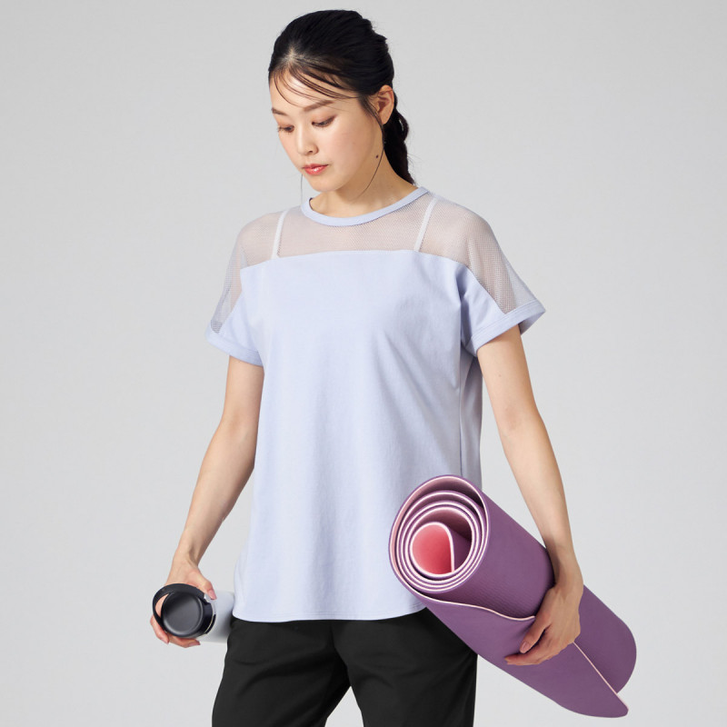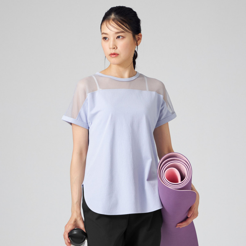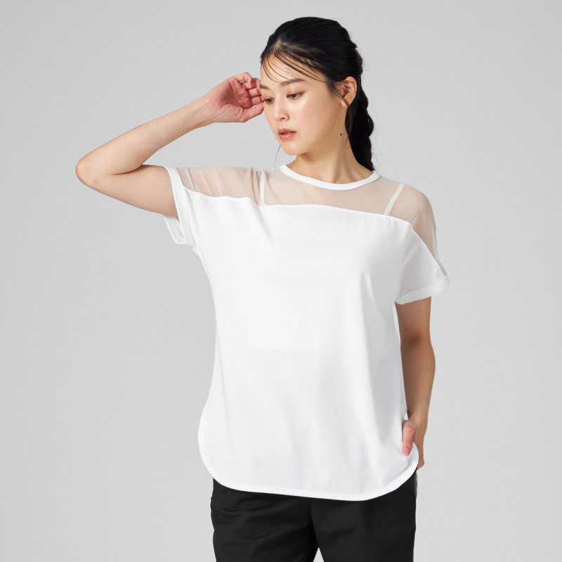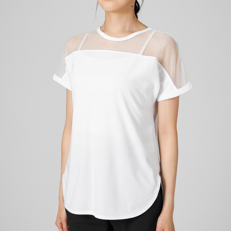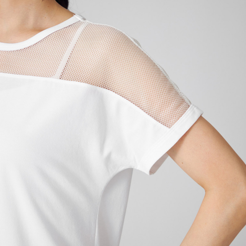 表面感が滑らかなコットンとトウモロコシ由来樹脂を含むポリエステルのハイブリッド素材を使用したレースコンビの半袖Tシャツ。