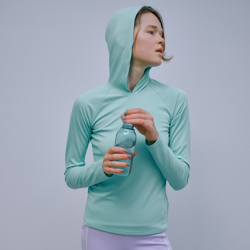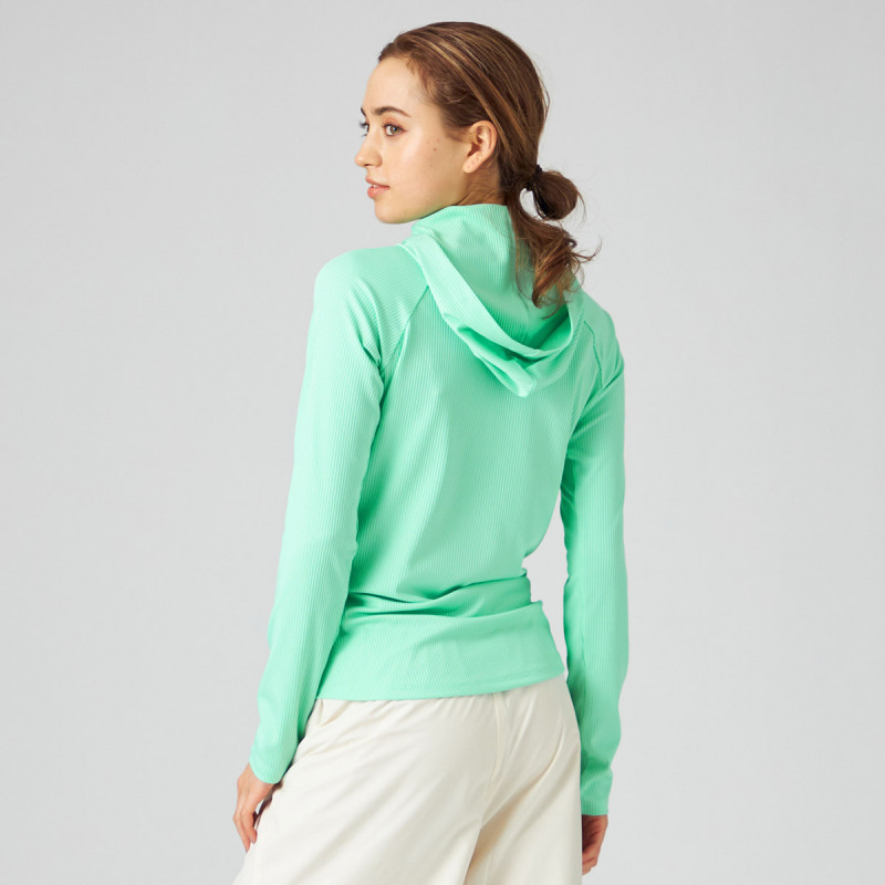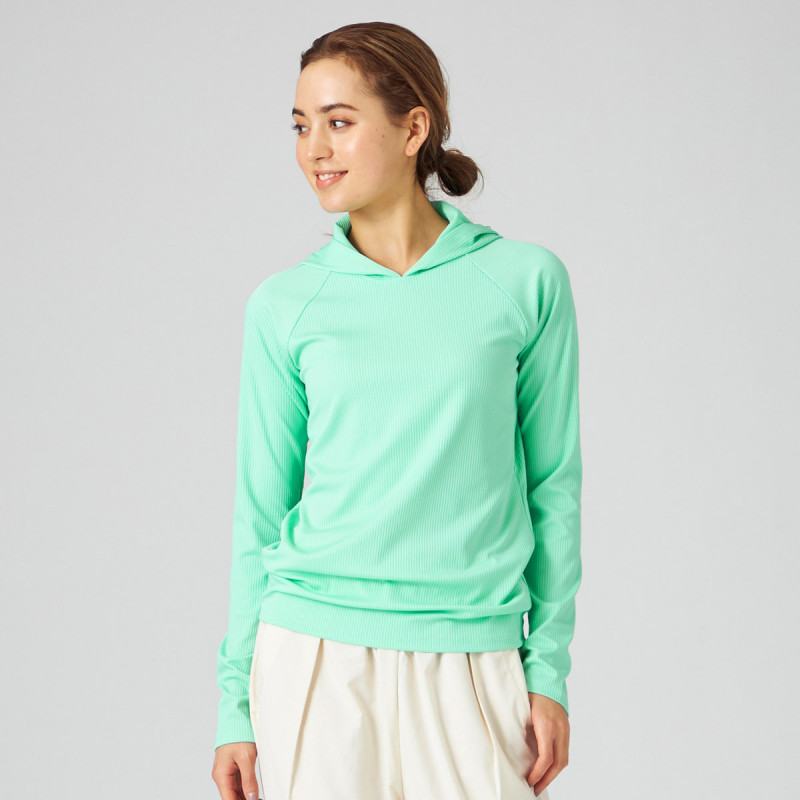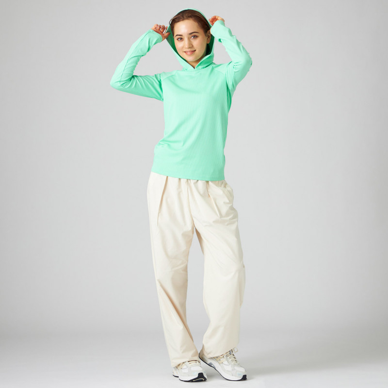 アウター用途のジップアップタイプと違いこれ一枚で着られるので、重ね着で嵩張りたくはないけれど半袖一枚では寒い、そんな少しウェアに悩む、冬の時期のウェーキングやランニングなど、外での運動シーンに最適。