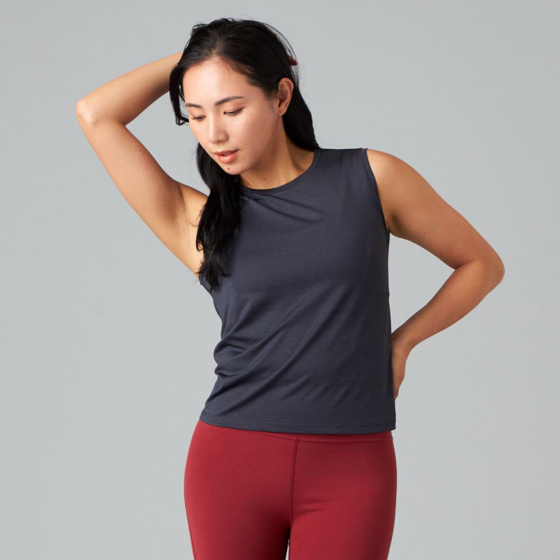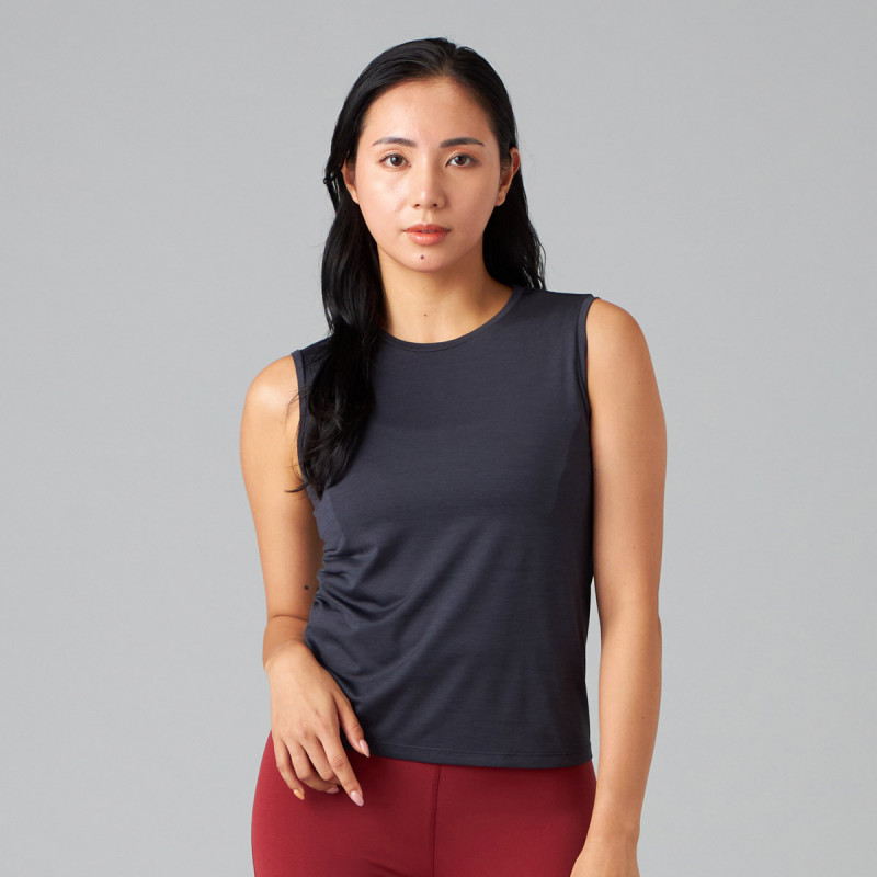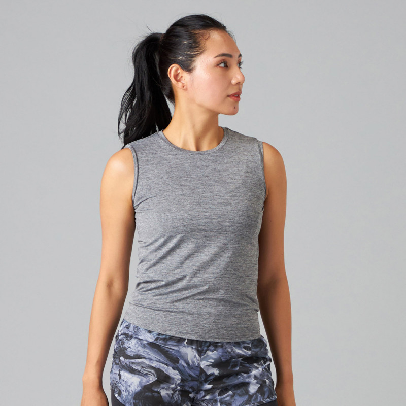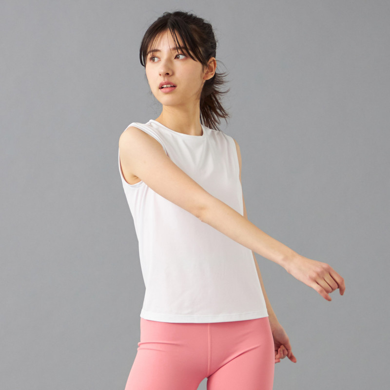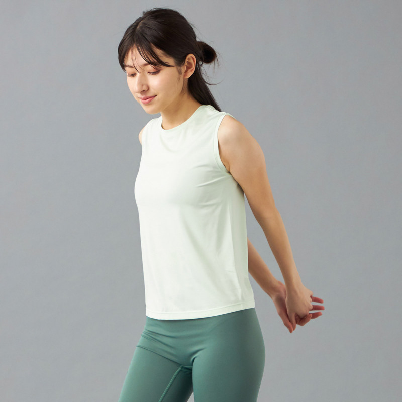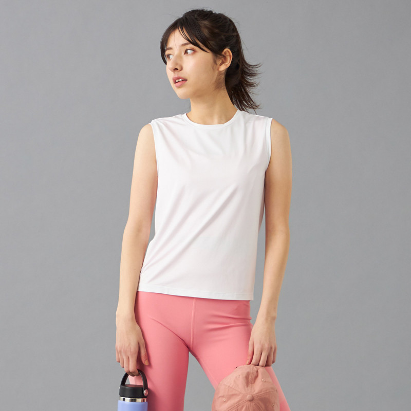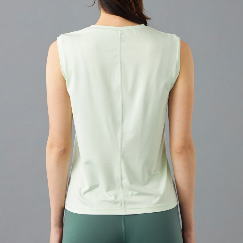 スポーツ素材で脇下に縫い目のない着心地の良いノースリーブシャツ。