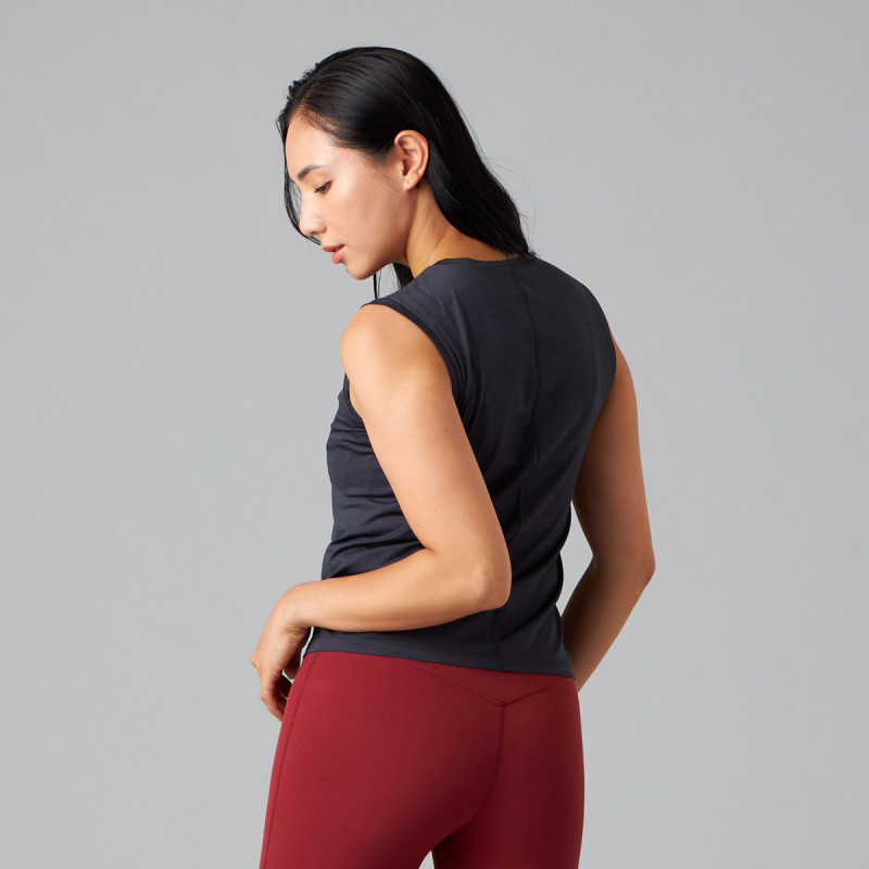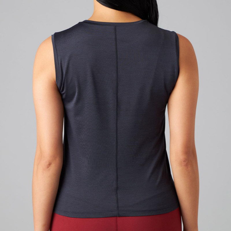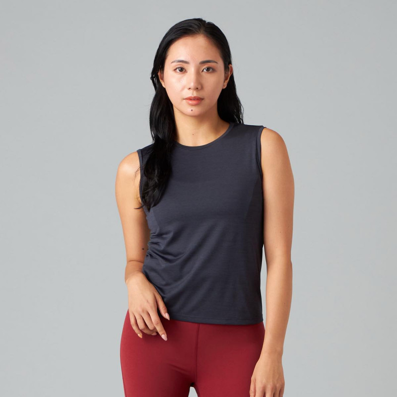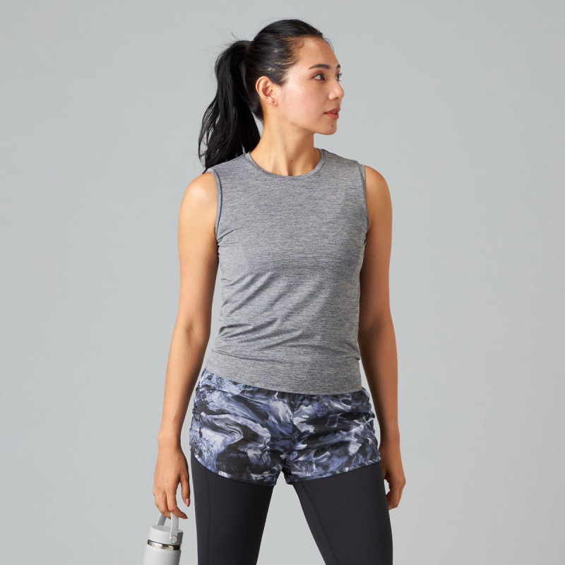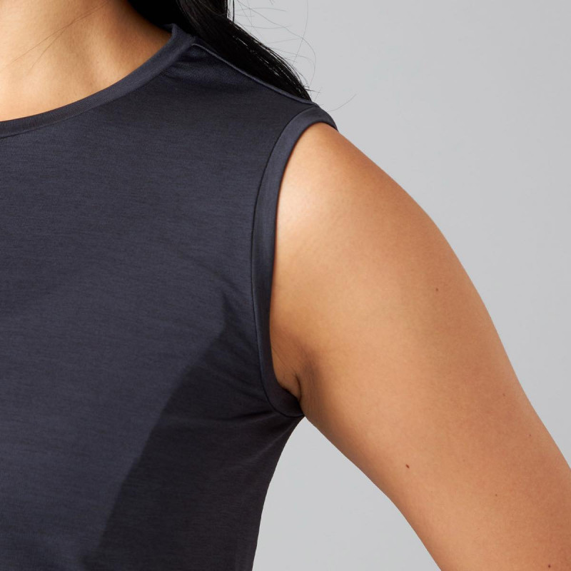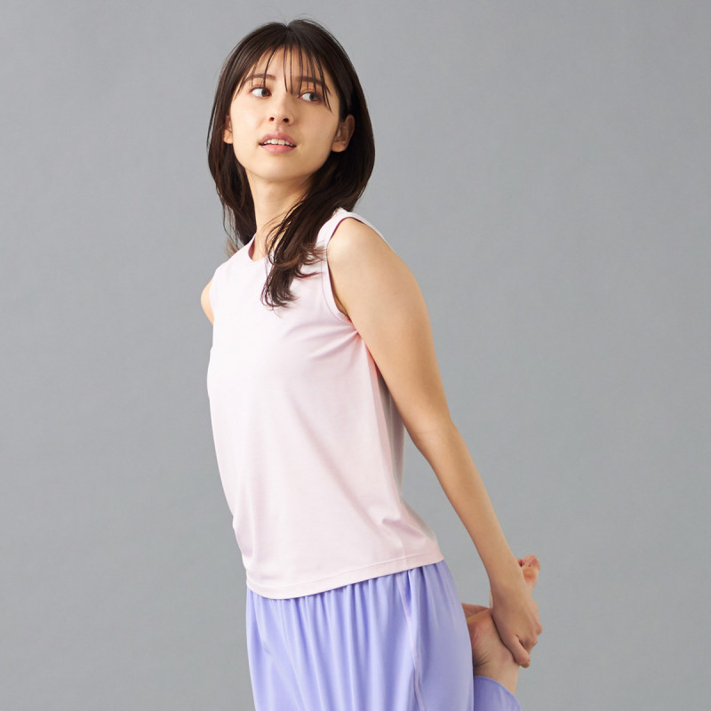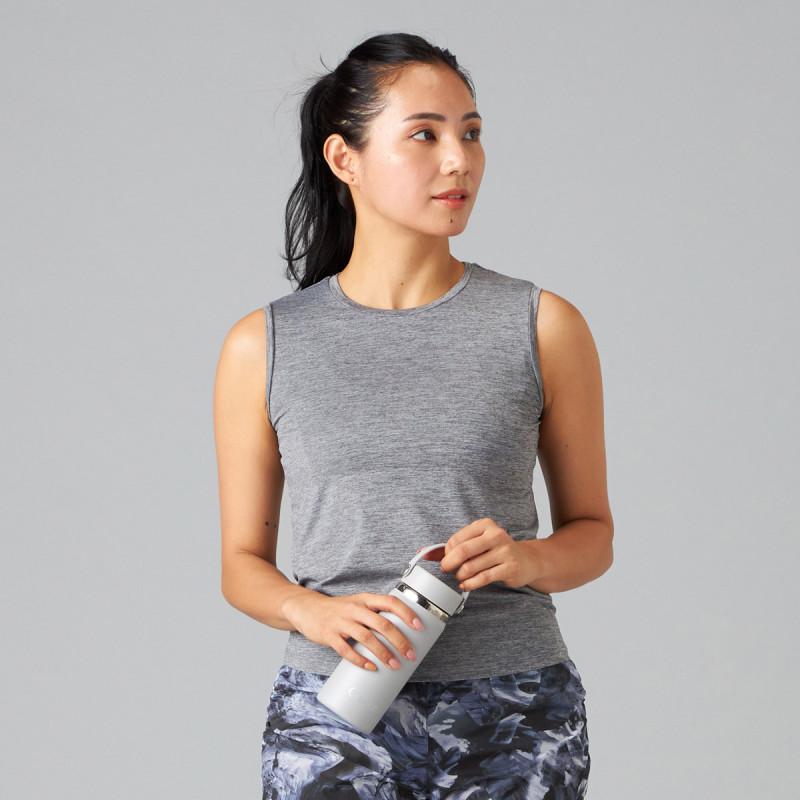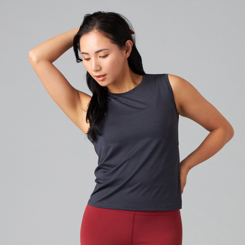 スポーツ素材で脇下に縫い目のない着心地の良いノースリーブシャツ。