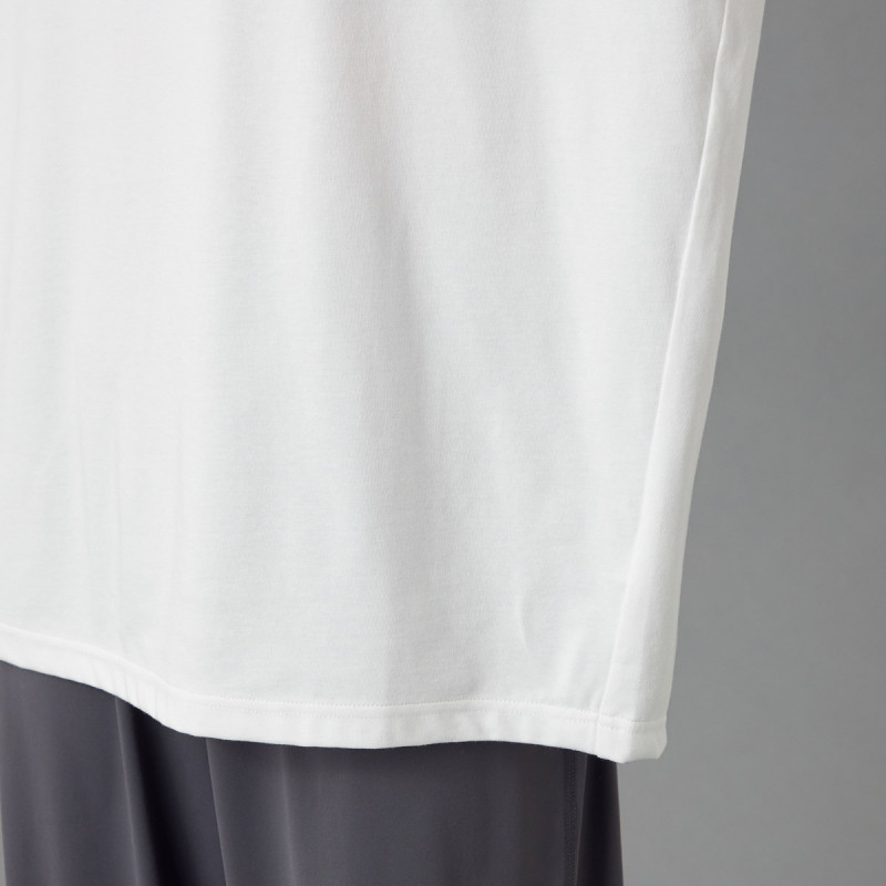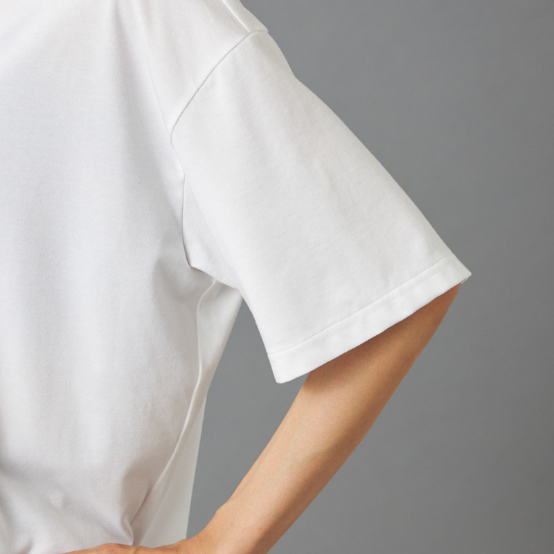 伸縮性にも優れた SORONAR※ というポリエステルを使用しストレッチ性があり、生地の表面をきれいに仕上げた滑らかな肌触りのプレーティング天竺。