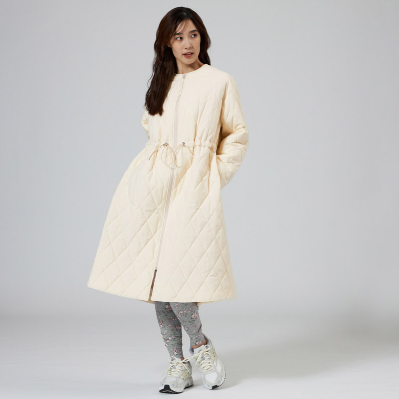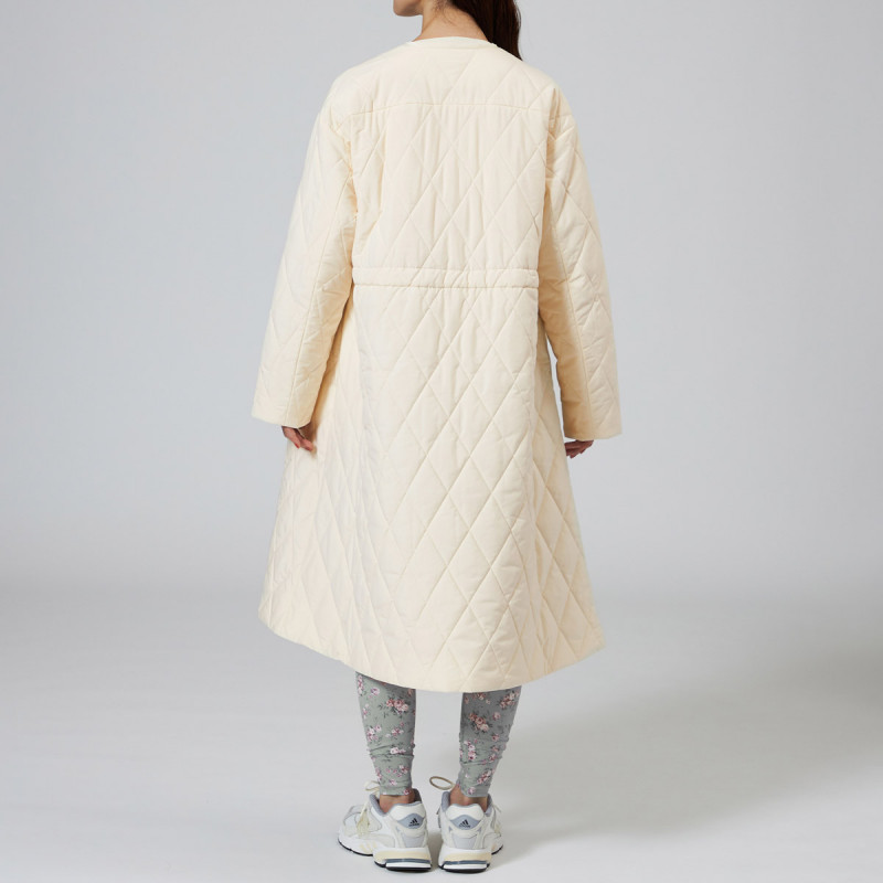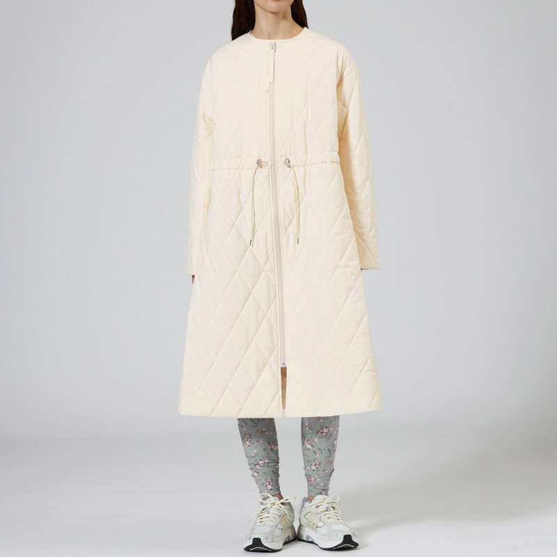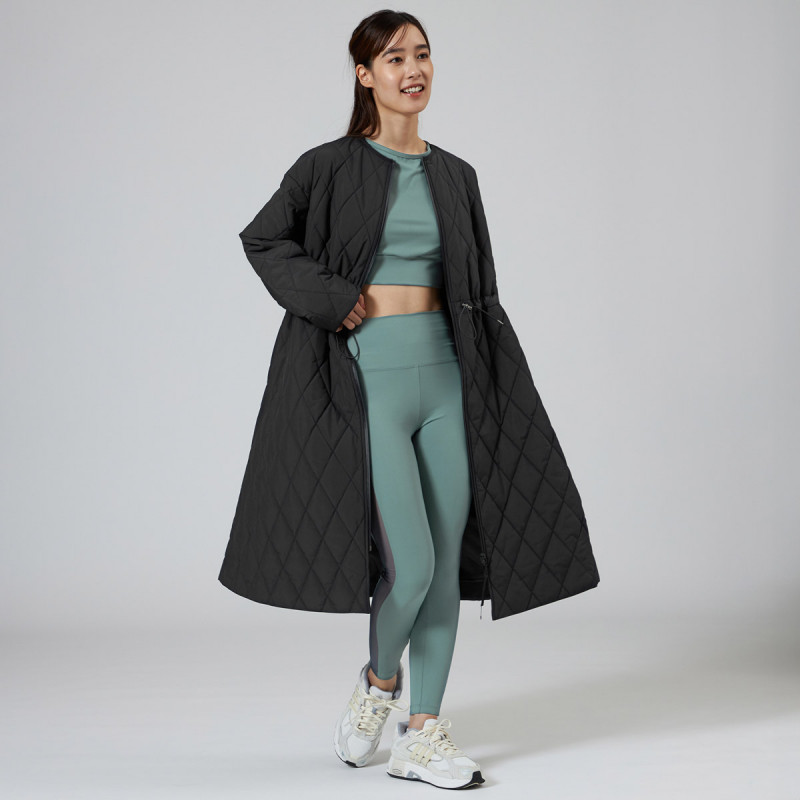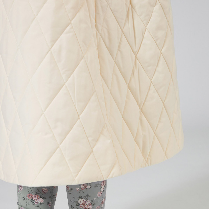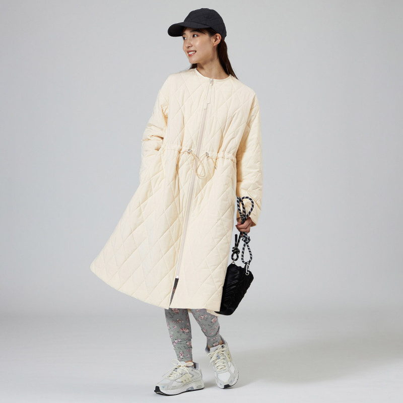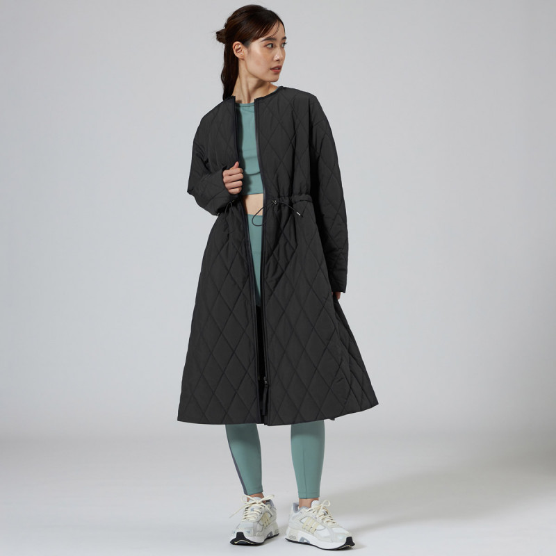 表地にイタリアメーカーの高機能タフタを用いた暖かシリーズのキルティングロングコート。