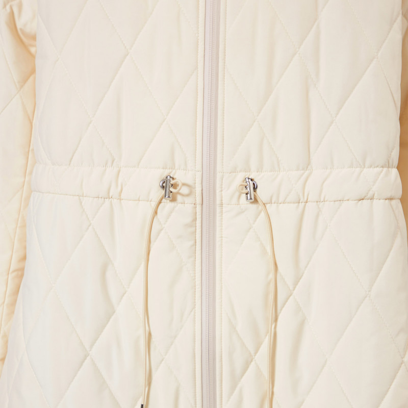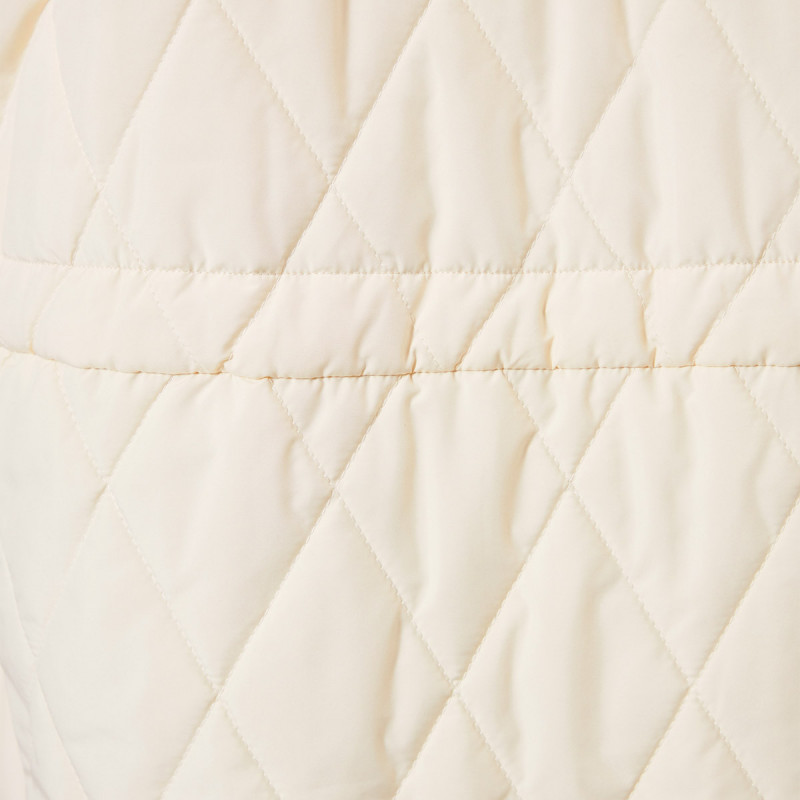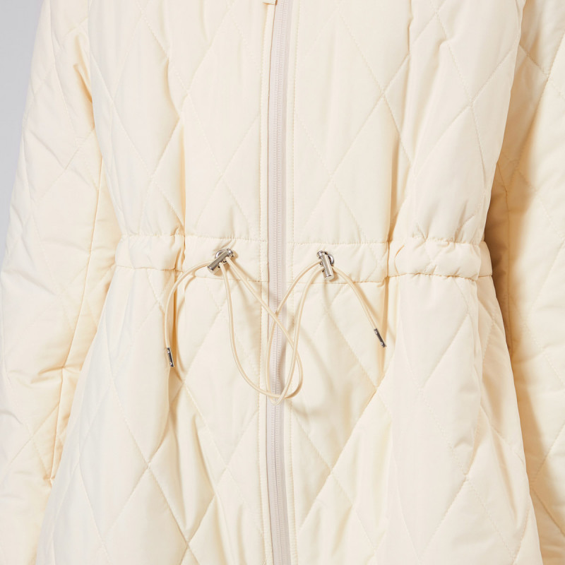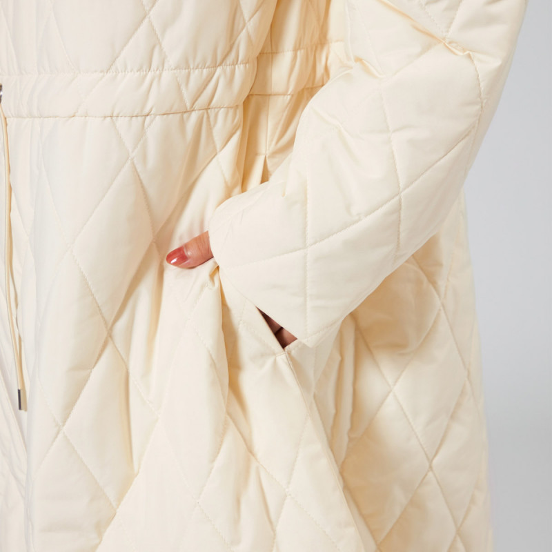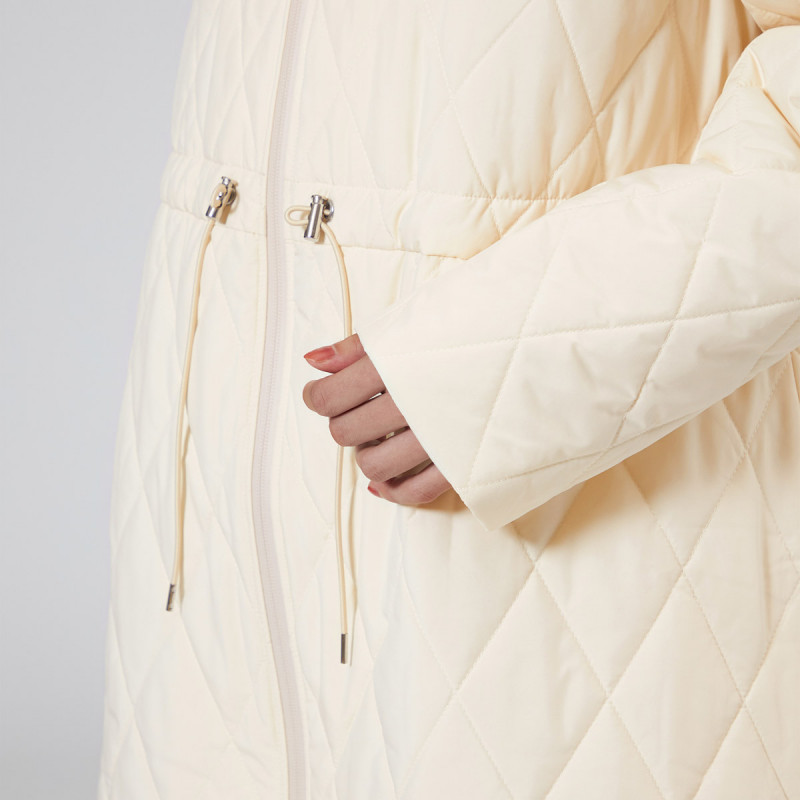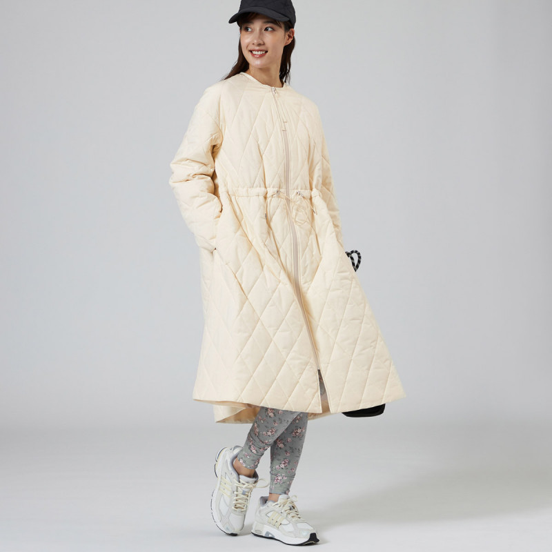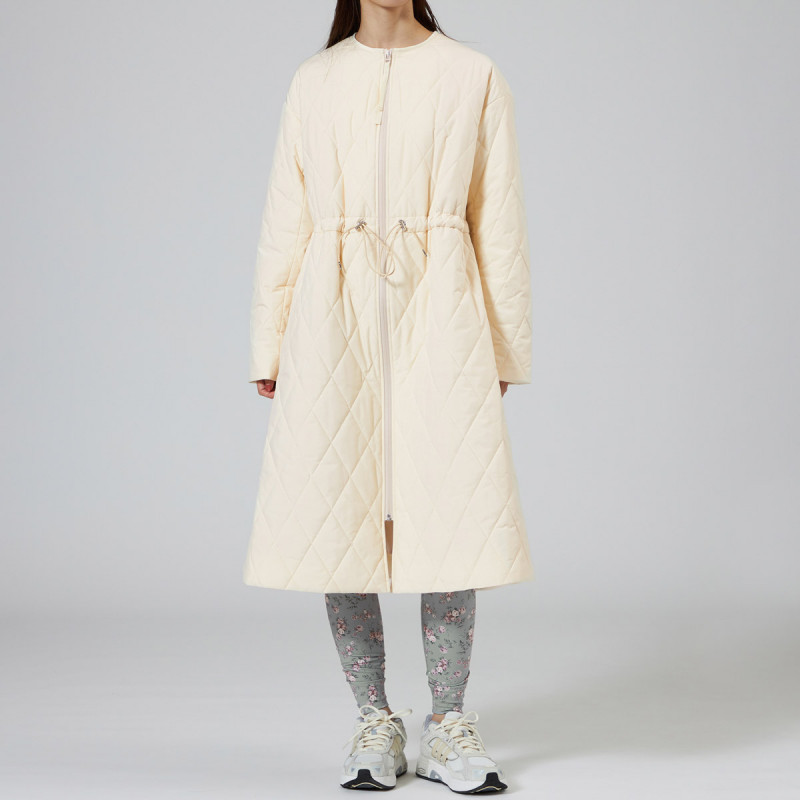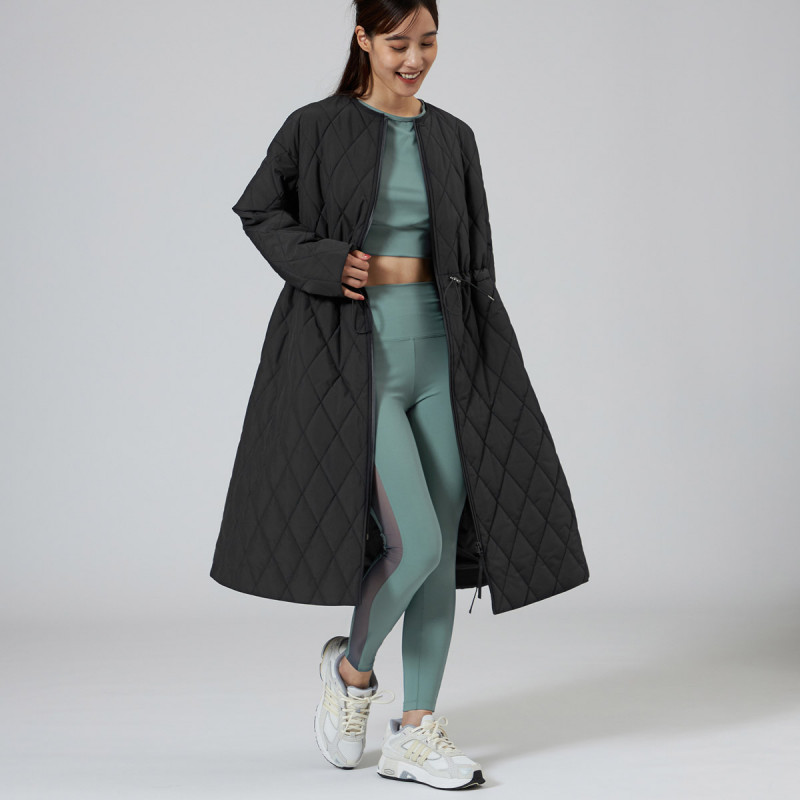 表地にイタリアメーカーの高機能タフタを用いた暖かシリーズのキルティングロングコート。