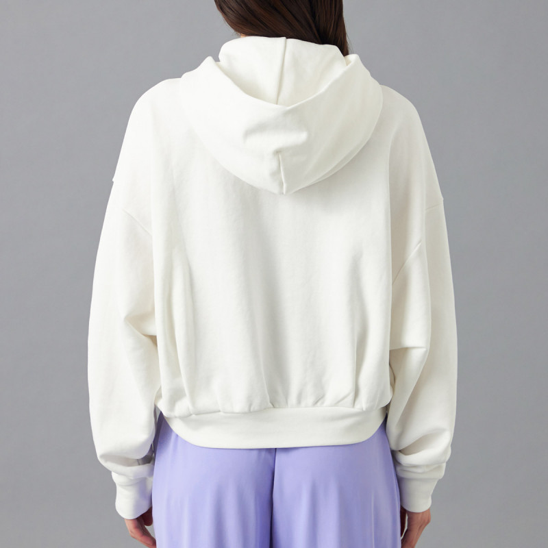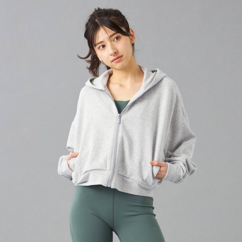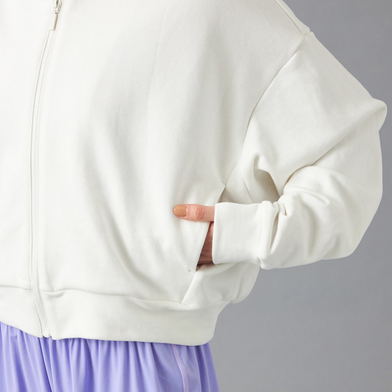 短めの丈とドロップショルダーで動きやすく、スポーティーな印象を引き立てる。
