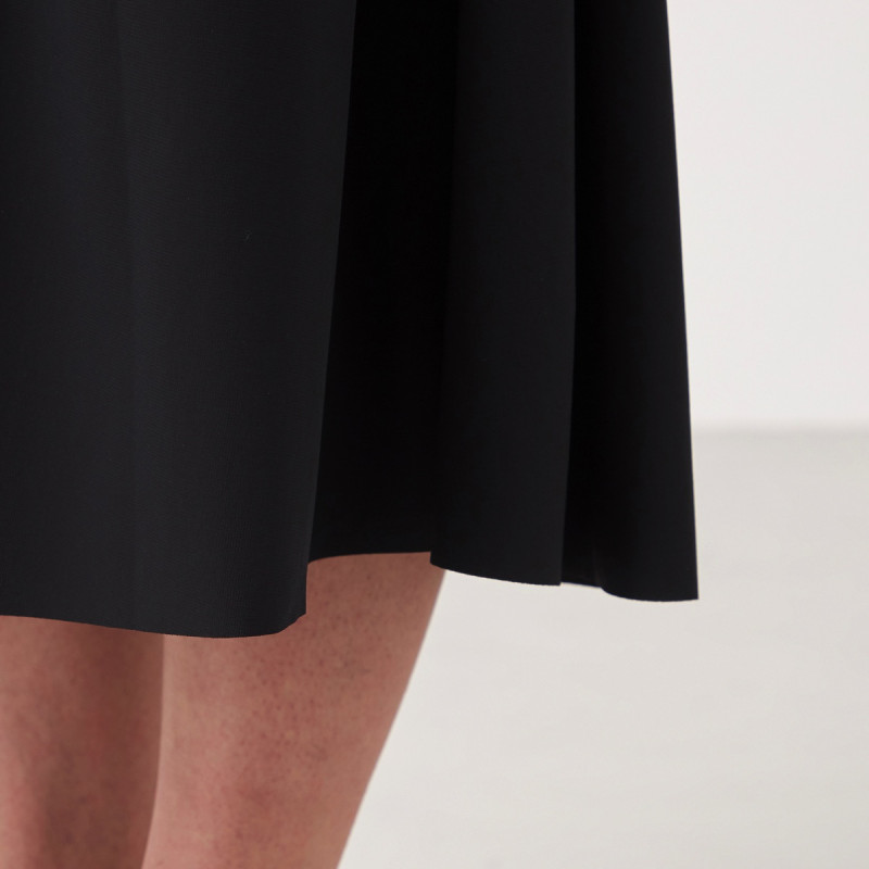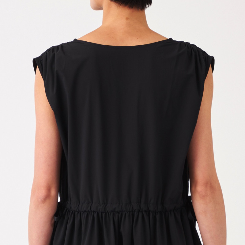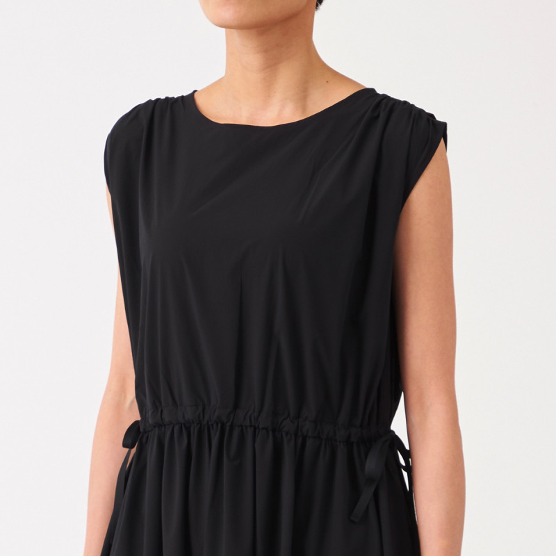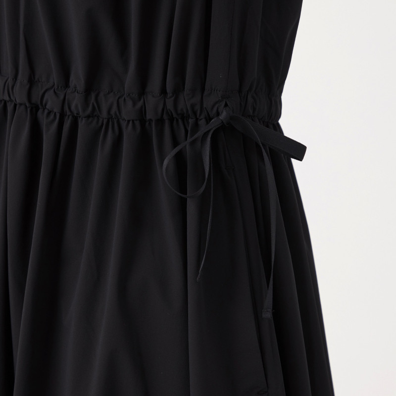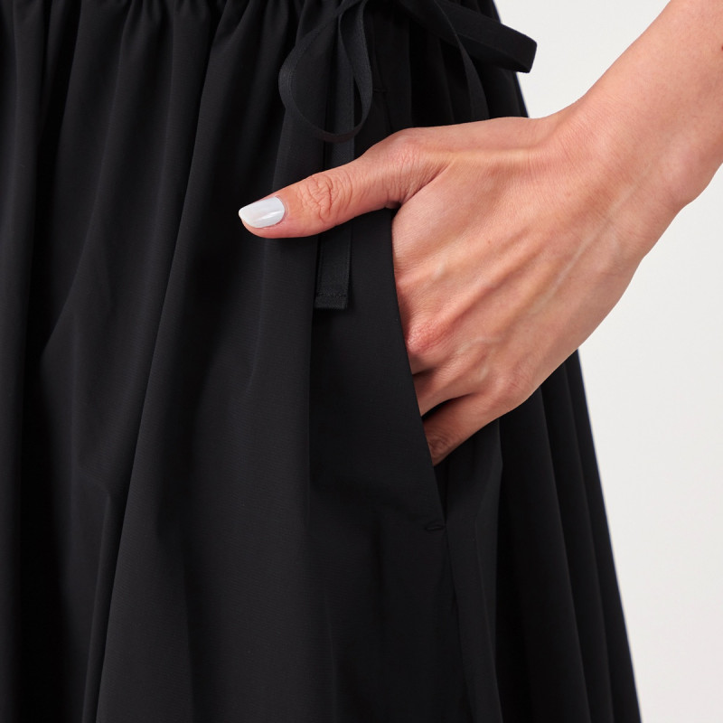ウエストにはゴム+リボンが内蔵され、そのまま絞らずラフにでも、リボンを絞ってウエストマークすればスタイルアップしても着用できる。