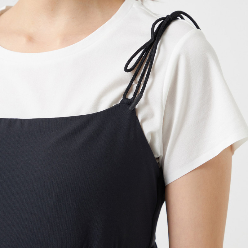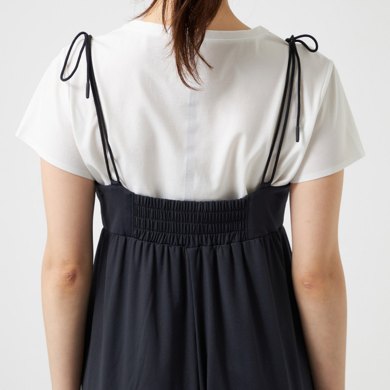 肩紐にストレッチ素材を使用し動いたときのつっぱり感を軽減し、肩紐の蝶結びのパーツは取外し可能。
