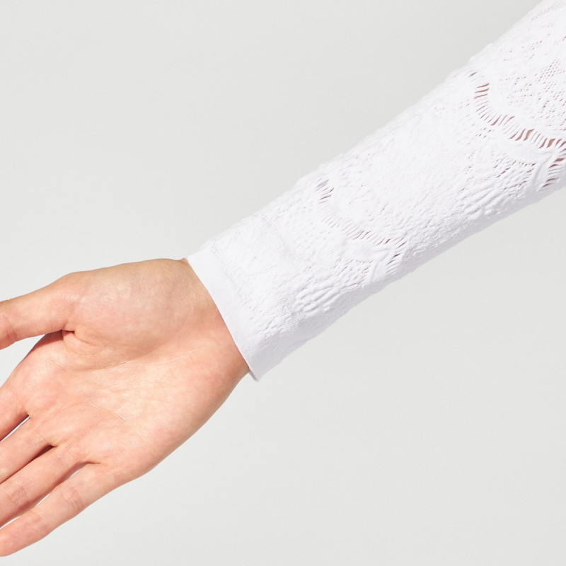 上品なシアー感で着る人を華やかに見せるスカラップレース柄もデザインポイント。