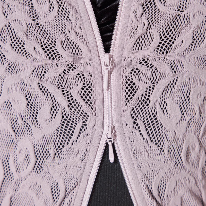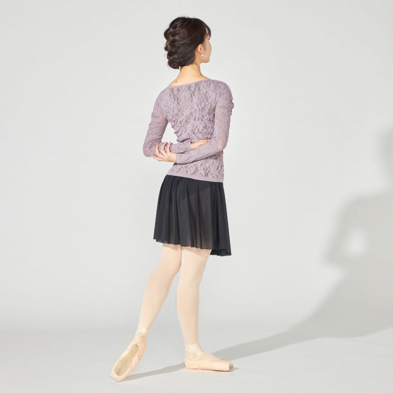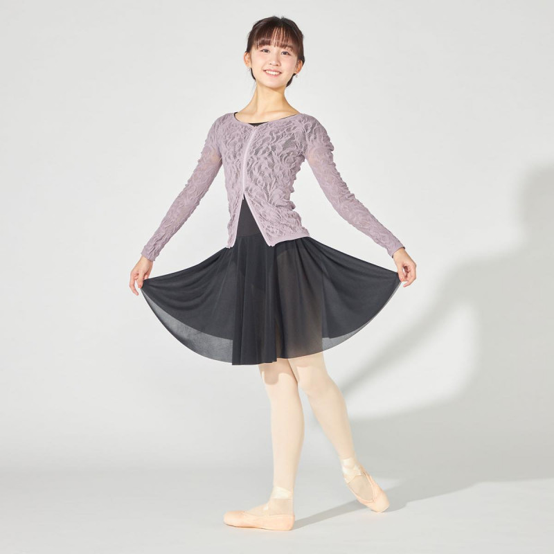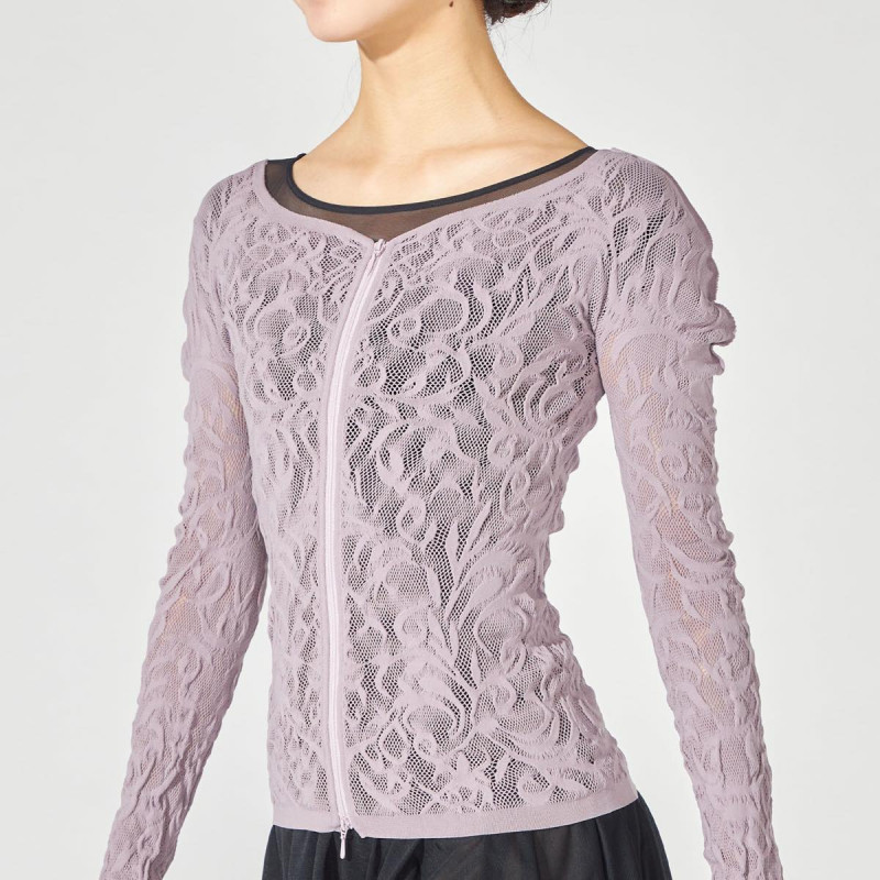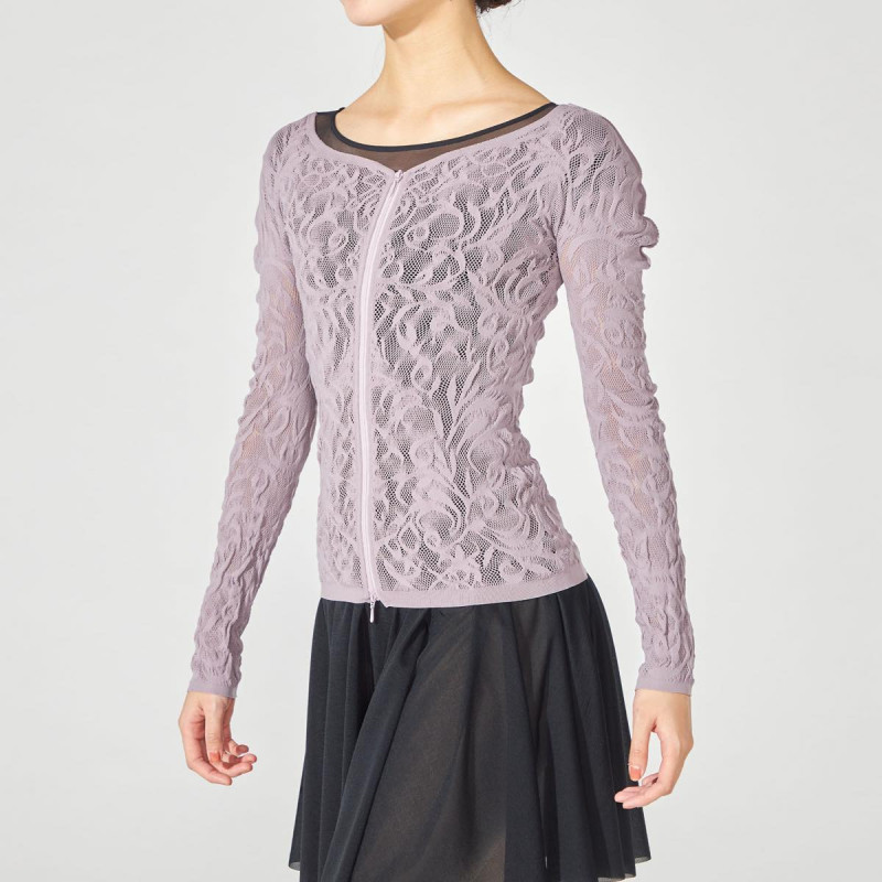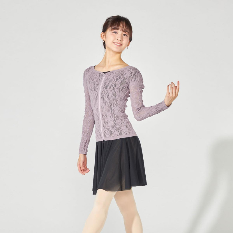 ファスナーは閉じたままでも脱ぎ着でき、レッスンシーンやコーディネートに合わせて開きの調節ができる便利なトップ。