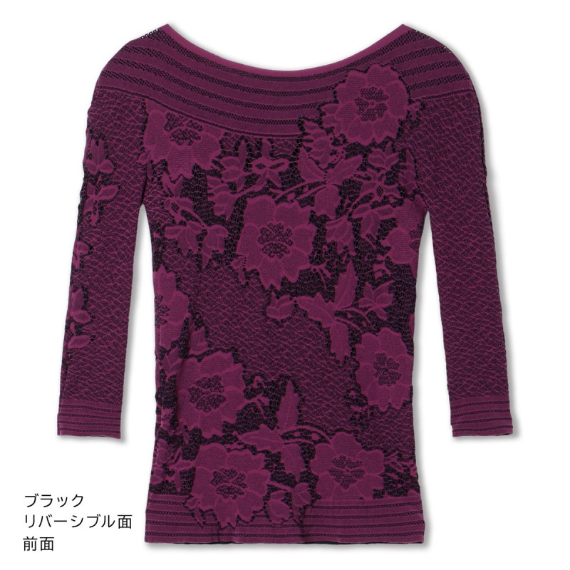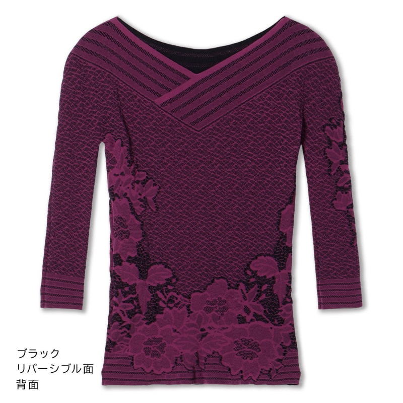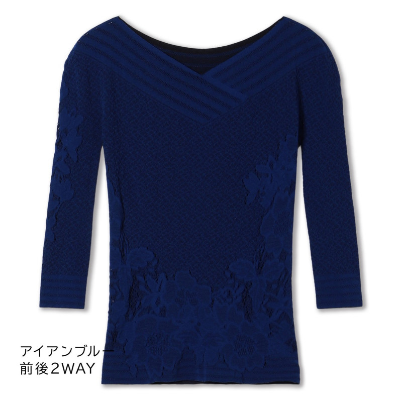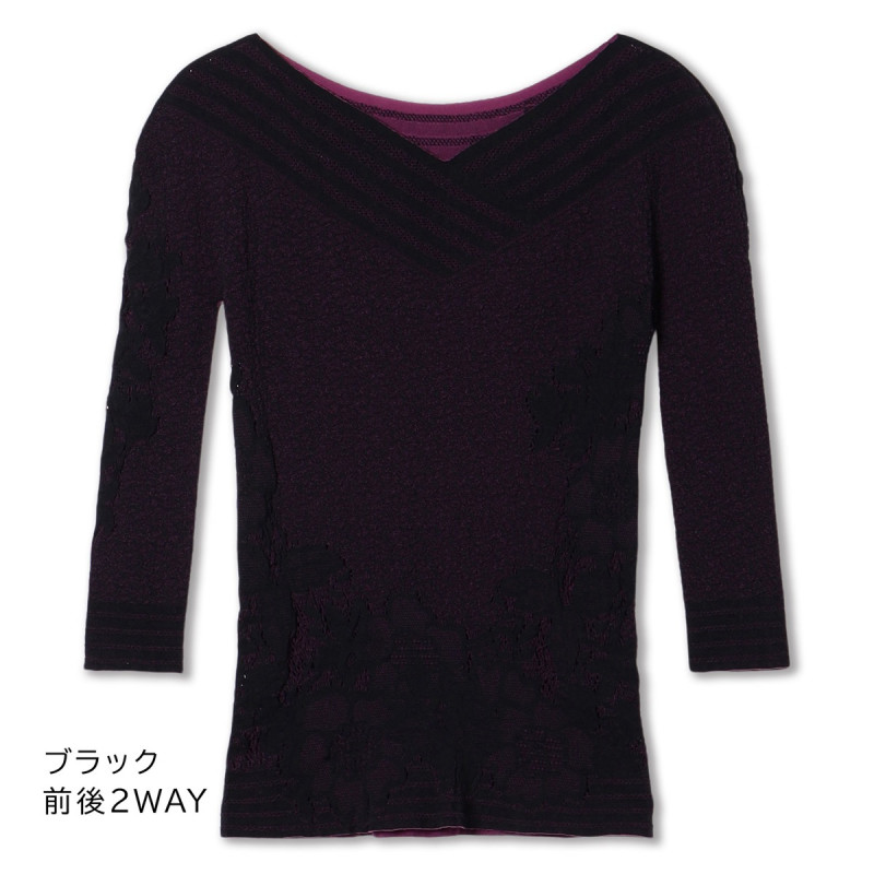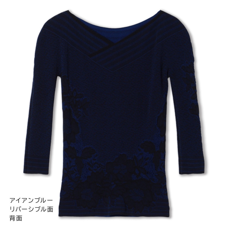 コーディネートやシーンに合わせて前後2Wayで、表裏リバーシブルでとノーソーイングニットならではの着方のバリエーションが楽しめるトップ。