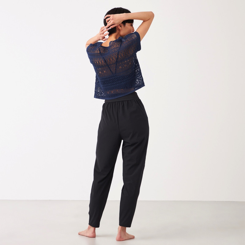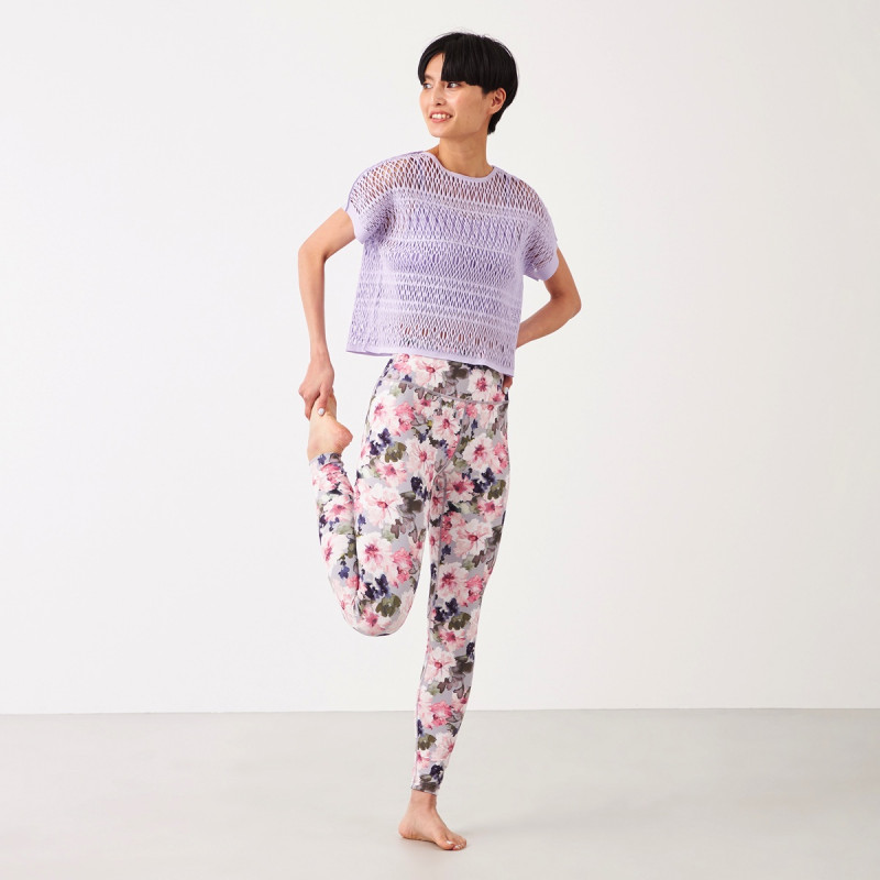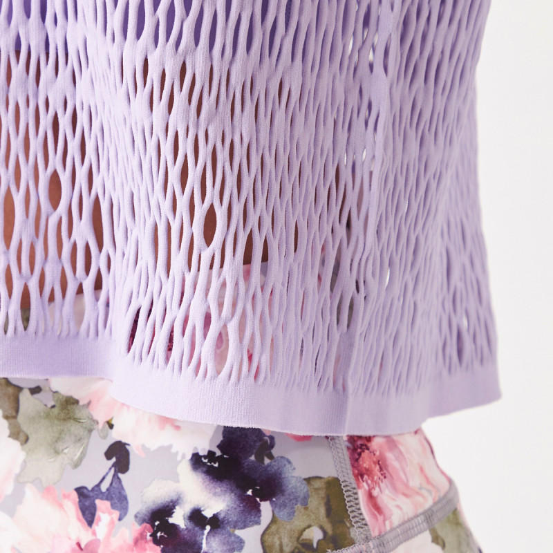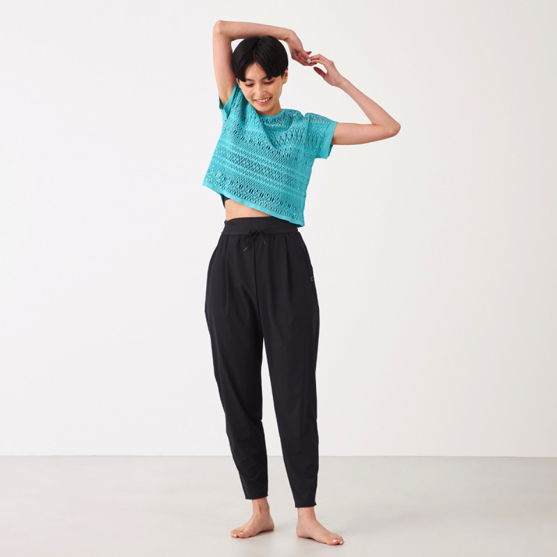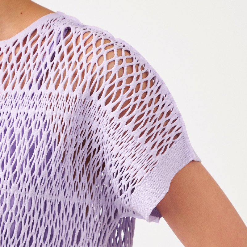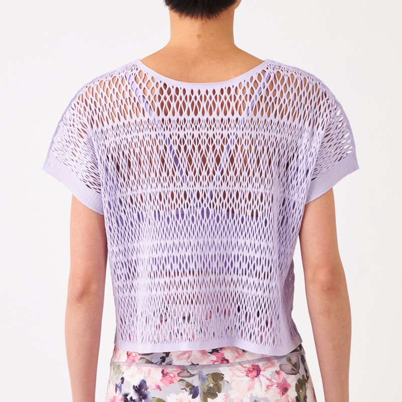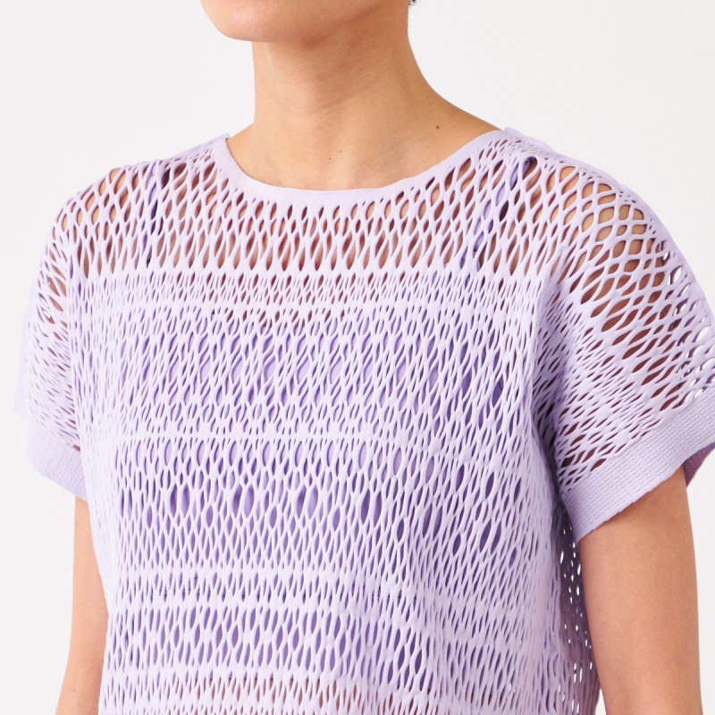 エンブロイダリーレース調の編地がポイントのクロップド丈のTシャツ。