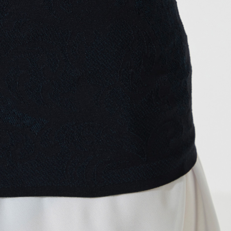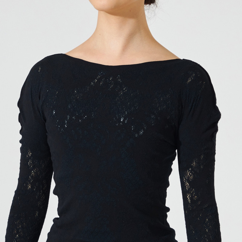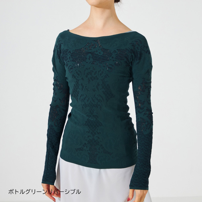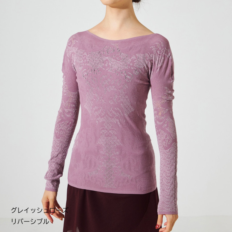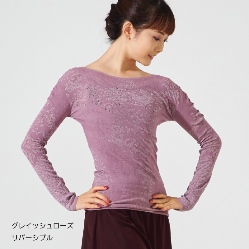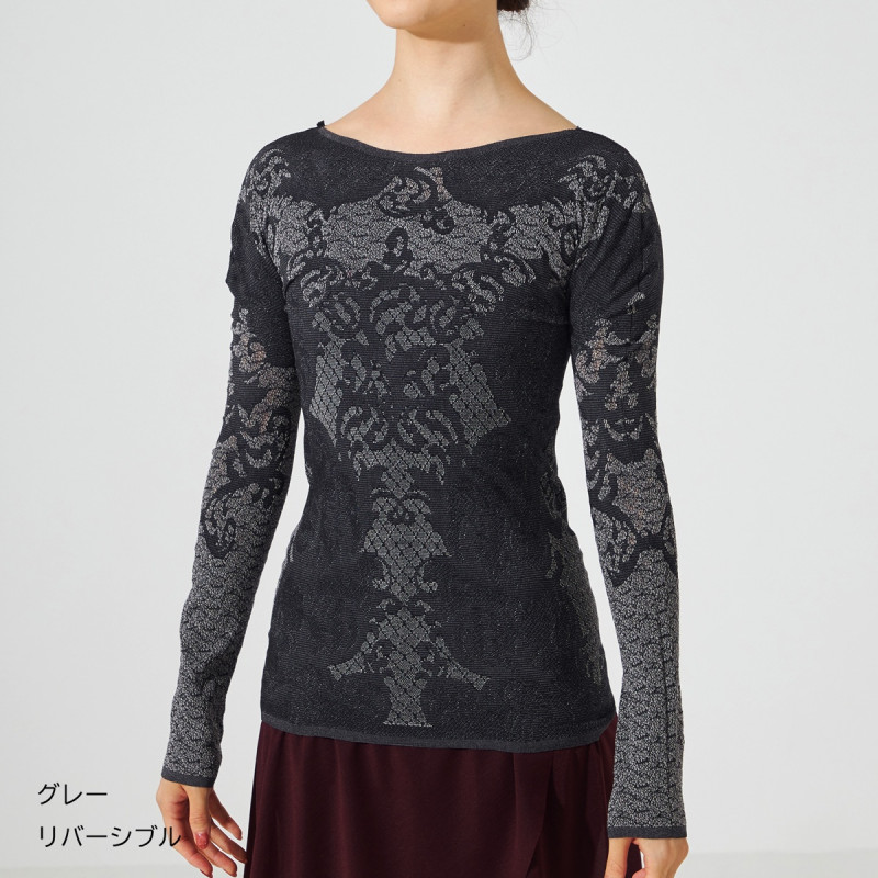 デコルテが美しく見えるボートネックのトップはバレエインペリアルの舞台をイメージした豪華な柄もデザインポイント。