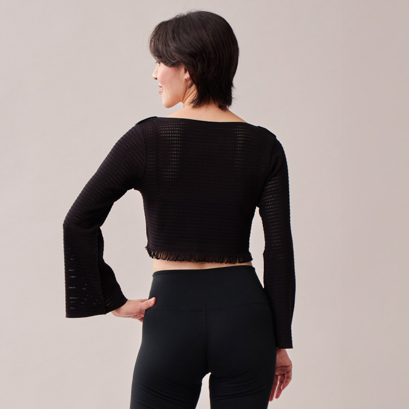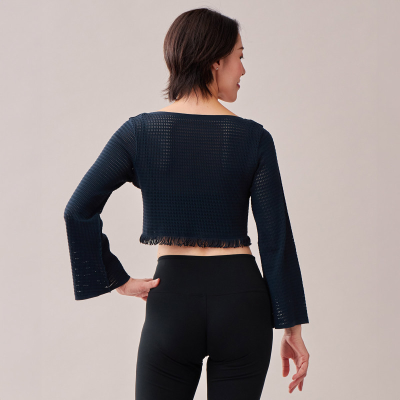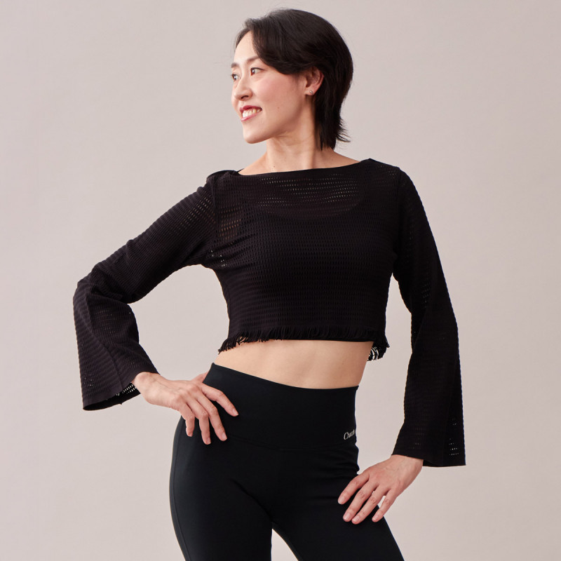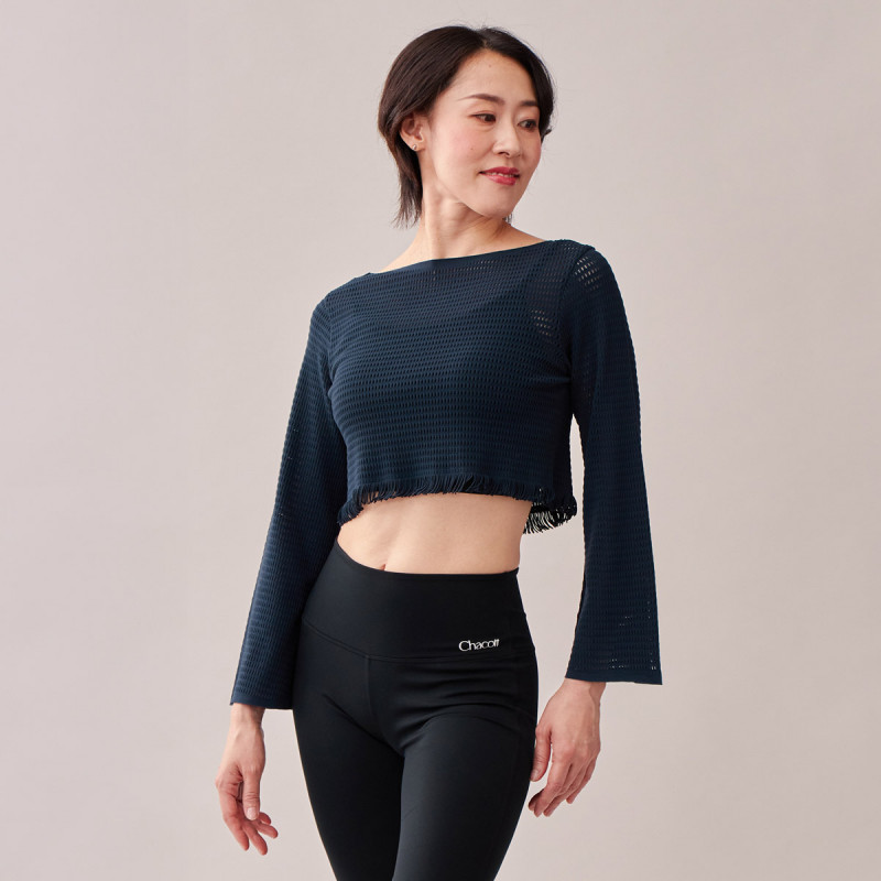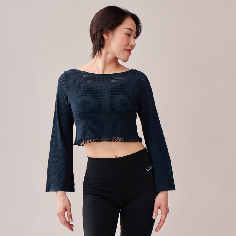 裾のフリンジとメッシュの編地がシャープな印象のショート丈トップは程よいフィット感で気になる上半身をカバーするイージーフィット。