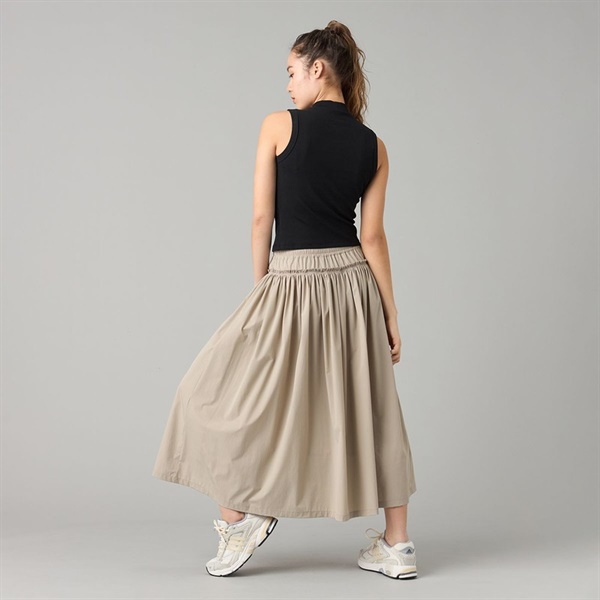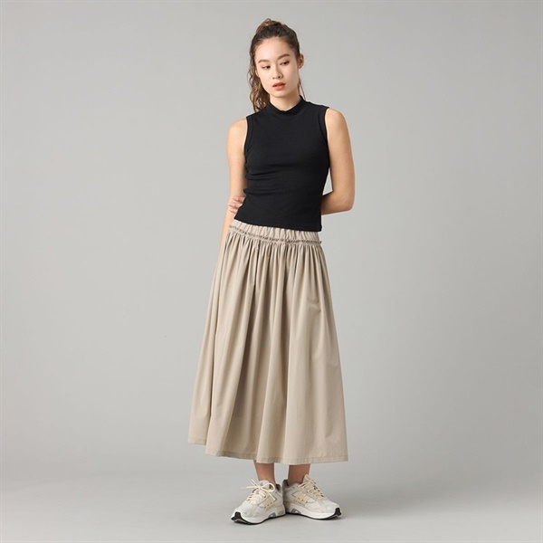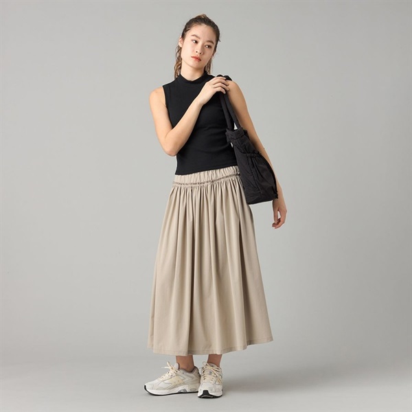 軽量で適度なハリ感があるUVカット素材を使用したマキシ丈スカート。
