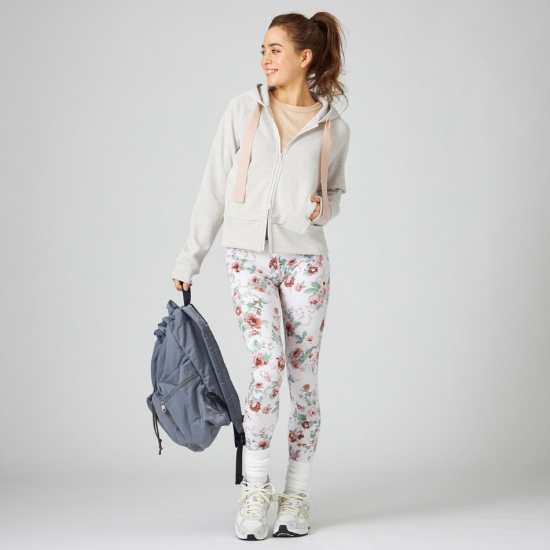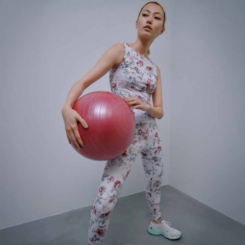 オリジナルで開発したポリエステルベースの素材を使用し、ナイロンに比べ吸水速乾性に優れたポリエステルベースなので、ホットヨガ用としてもすすめ。