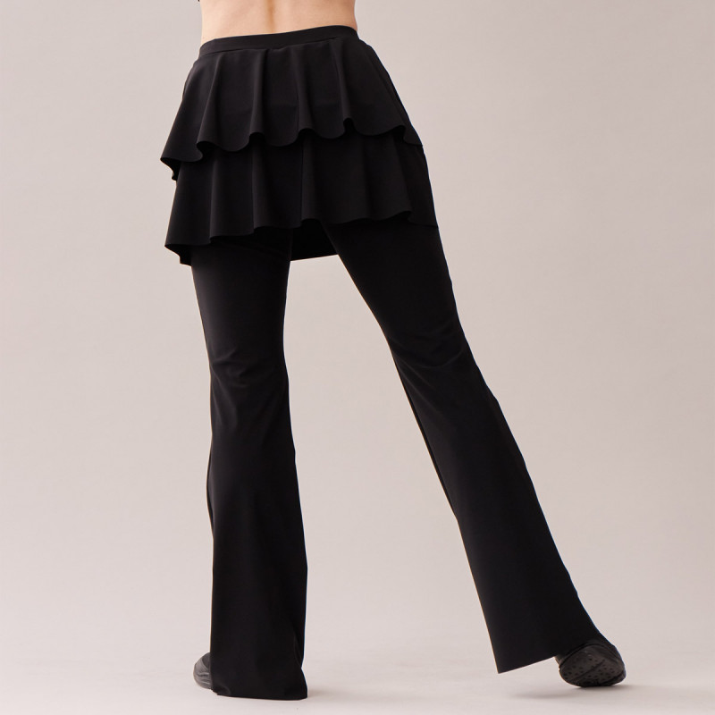 ●バックスカートがティアードになっている人気のスカートをつけたブーツカットスパッツ。