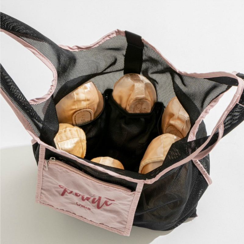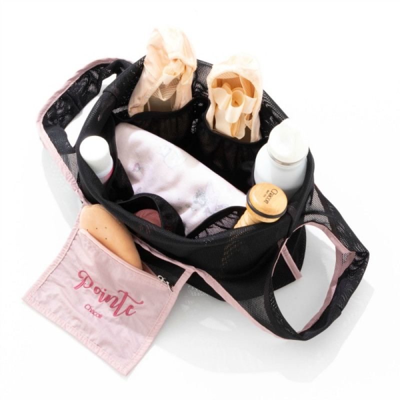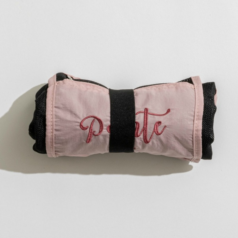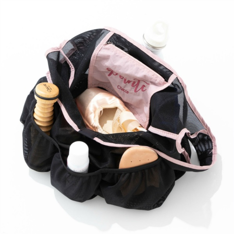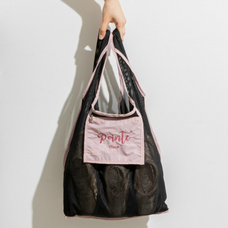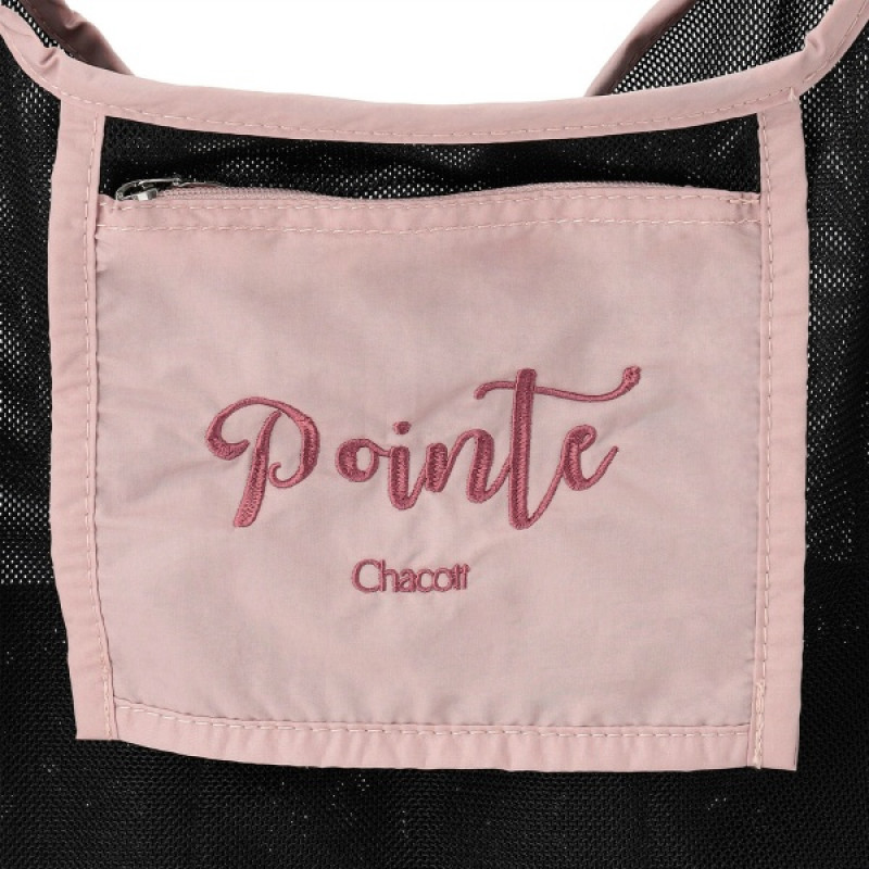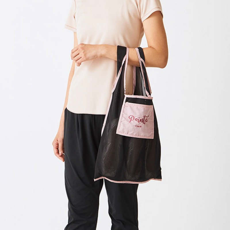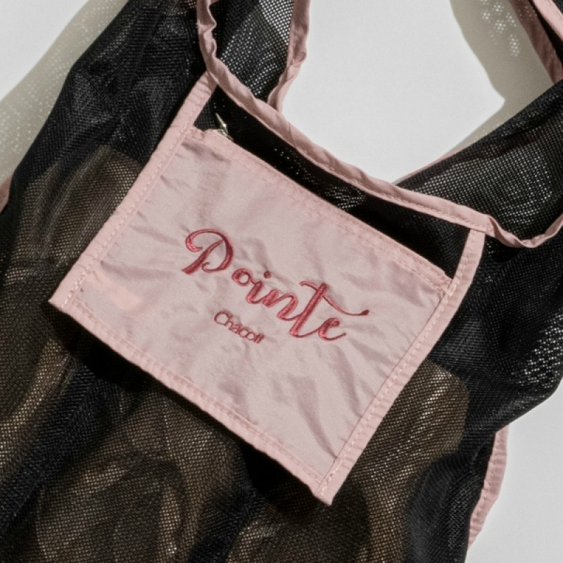 可愛いポワントの刺しゅう入りのポケット付き。トゥパットやケア用品等の小物を収納に便利。