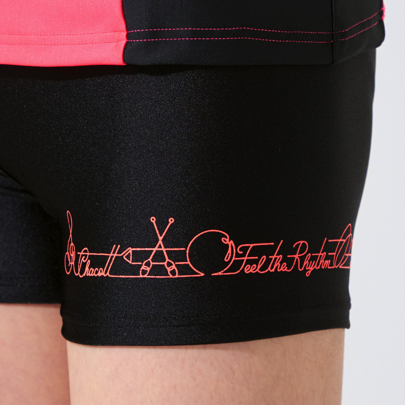 「Chacottロゴ」と2023年キーワードの「Feel the Rhythm」を手具モチーフと共に一筆書き調のラインアートにアレンジしたシンプルかわいいロゴプリント。