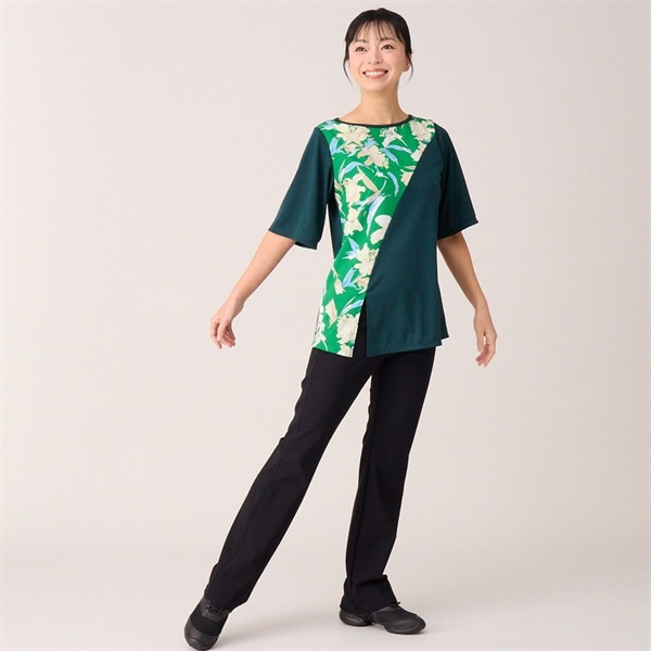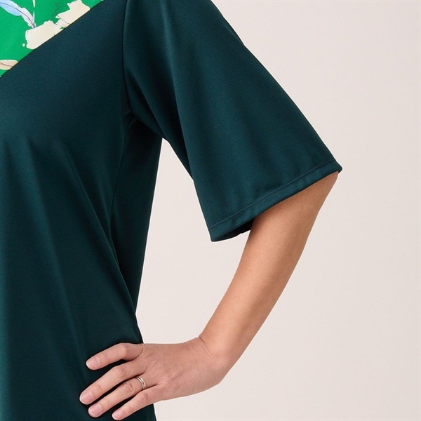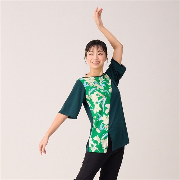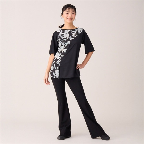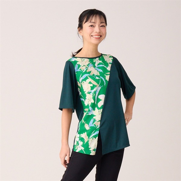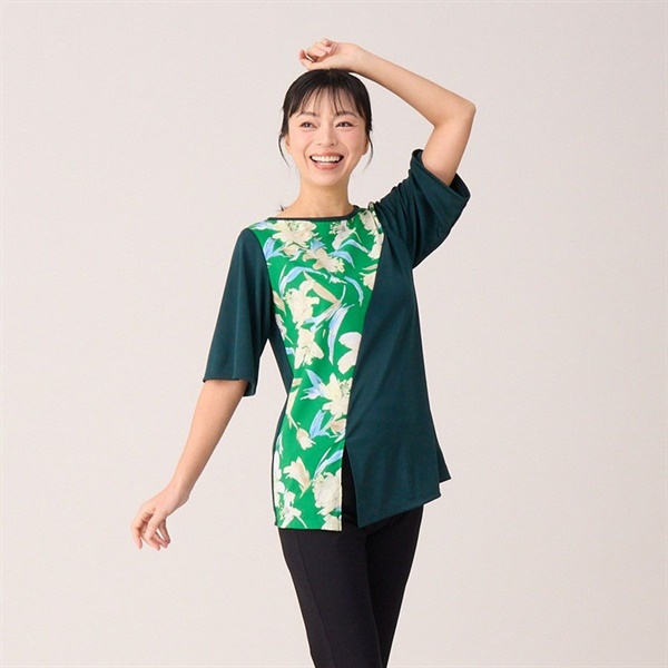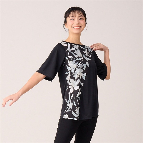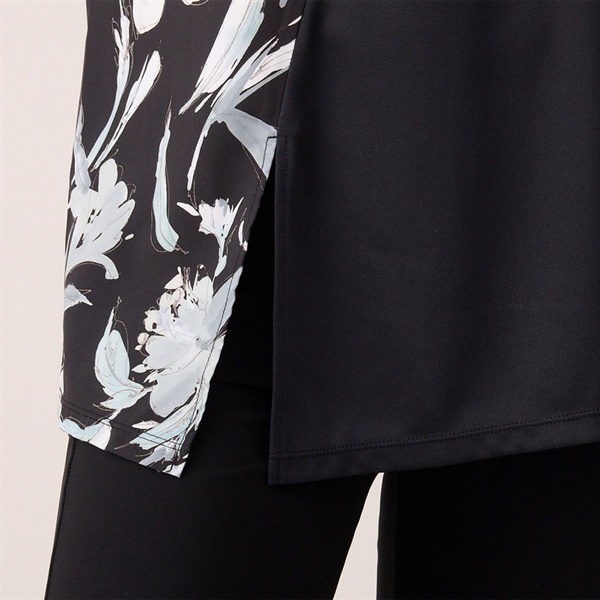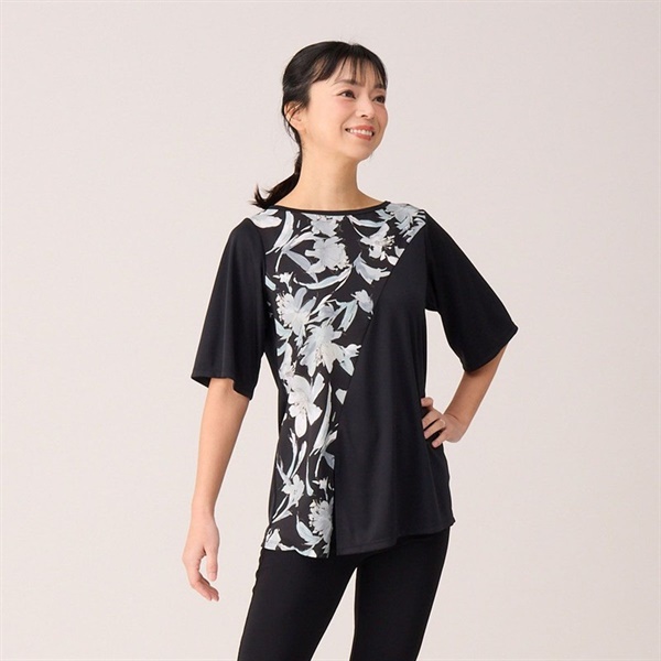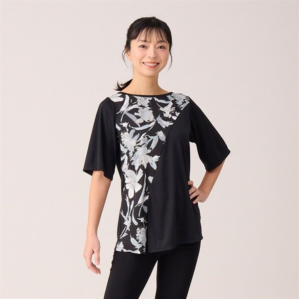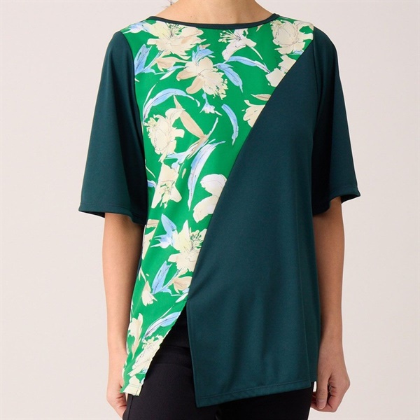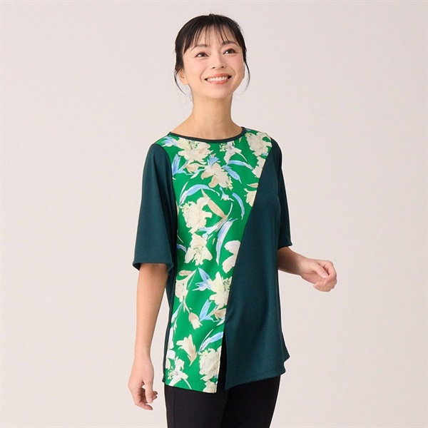 鮮やかなプリント柄との組み合わせ、大胆な切り替えのデザインが上半身の気になる部分をシャープな印象でカバー。