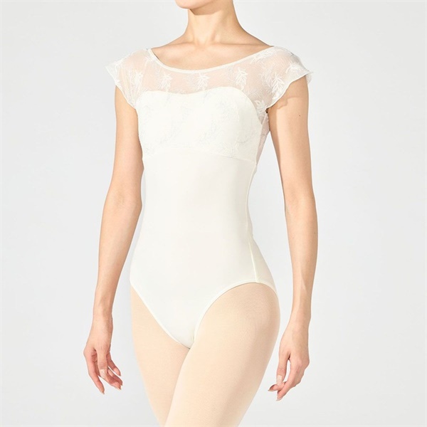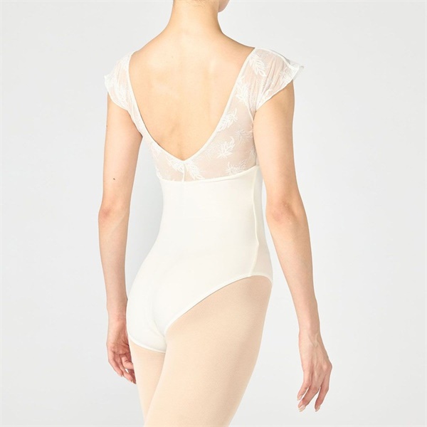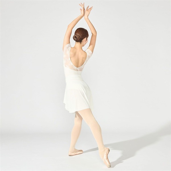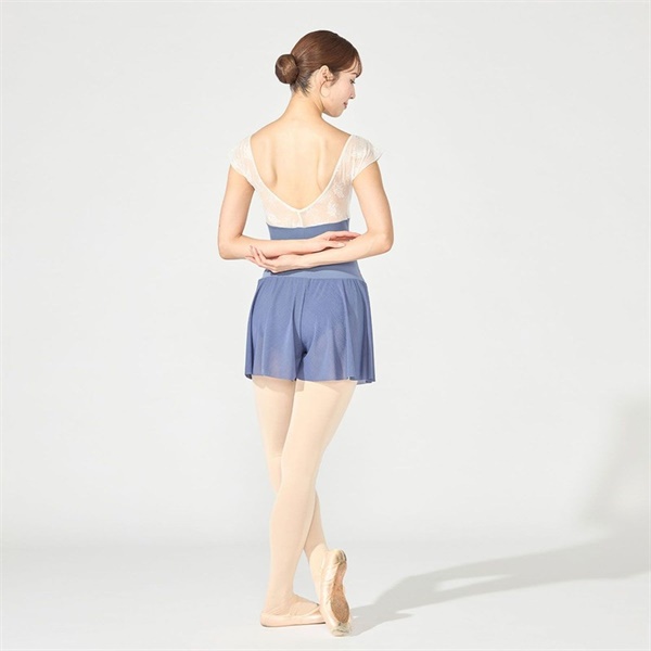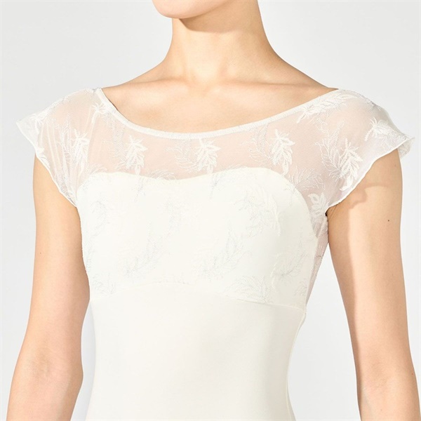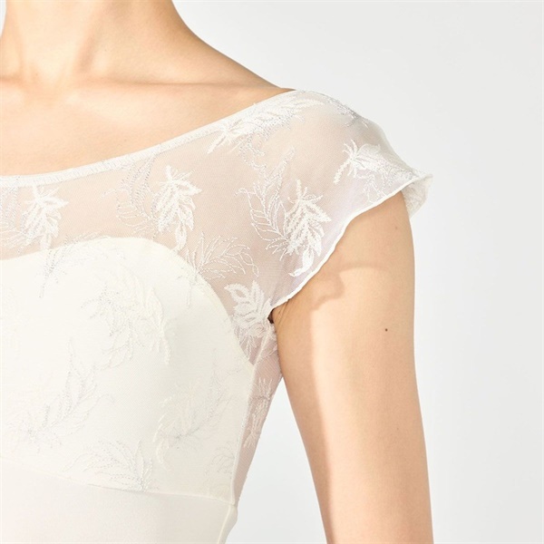 バストアップにエンブロイダリーチュールを切り替え、華やかな素材の魅力を引き立てたフレンチスリーブレオタード【デザインポイント】ラメ糸を織り交ぜたフェザー柄の刺繍が印象的なエンブロイダリーチュールと、優れたストレッチ性とフィット感で人気のソフトスムースを組み合わせたシリーズ。繊細な華やかさと快適な着心地を兼ね備えたデザインです。ほんのりフレアー感のあるシルエットの袖は女性らしい印象を与えます。脇までしっかりカバーする安心感のある着心地です。《裏仕様》バストパッドポケット付き