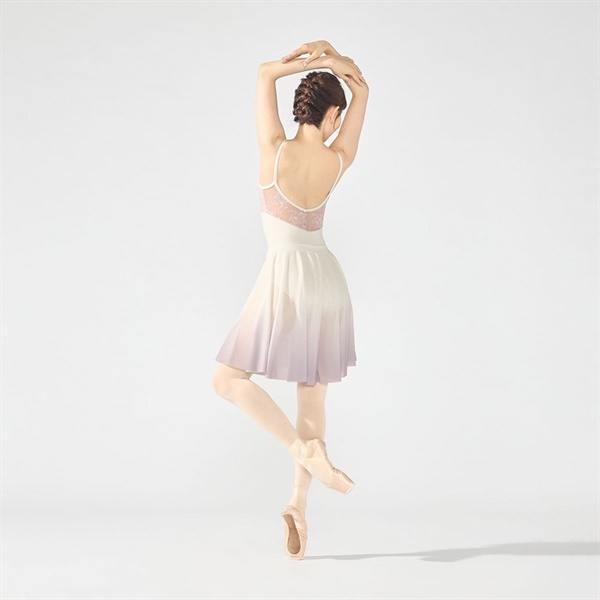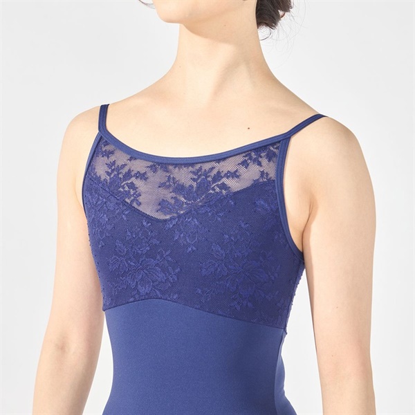 衿ぐりから肩に繋がるストラップデザインがデコルテを広く見せるキャミソールレオタード