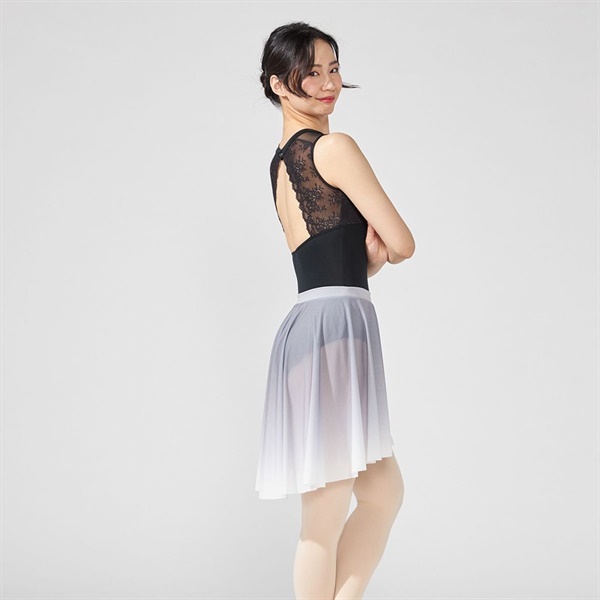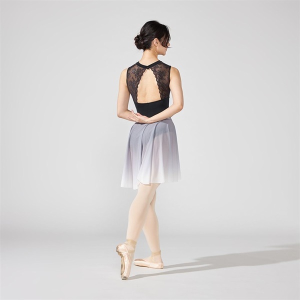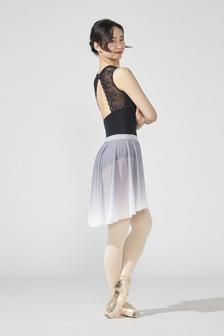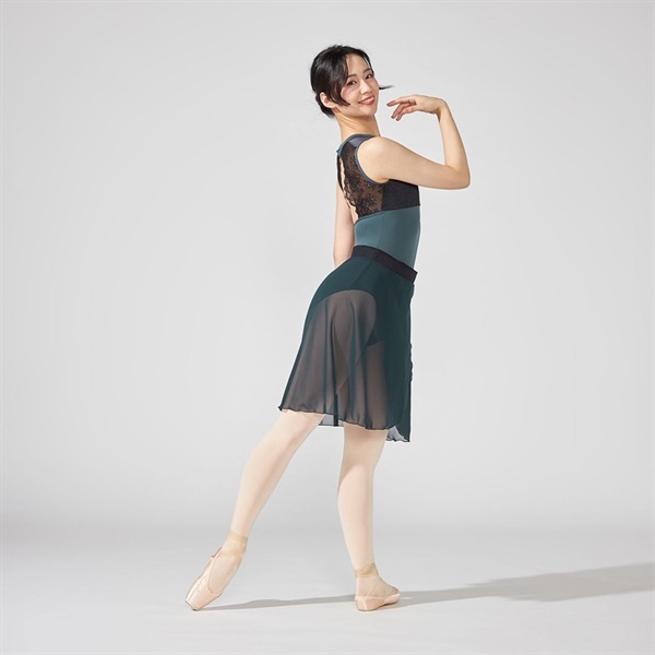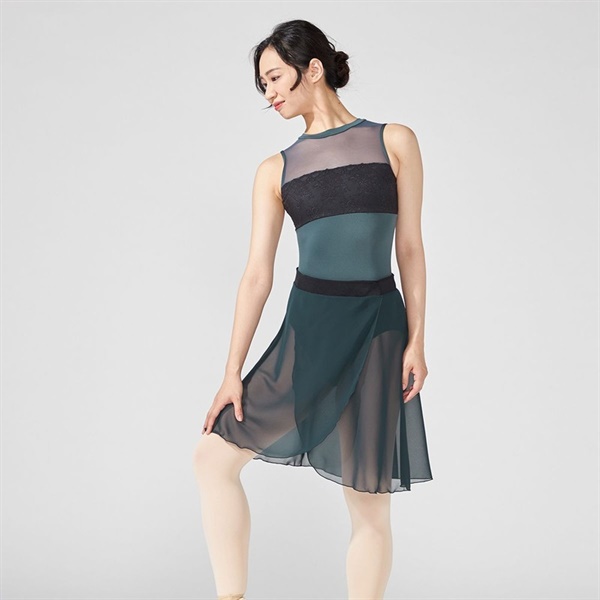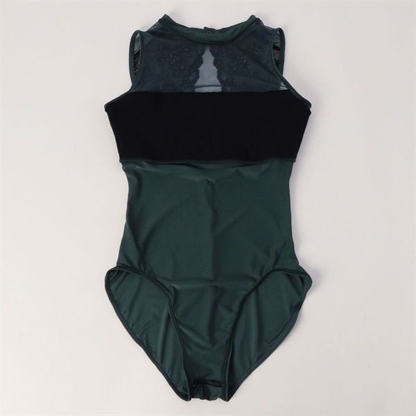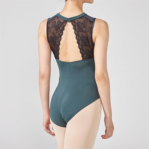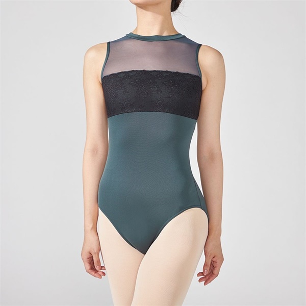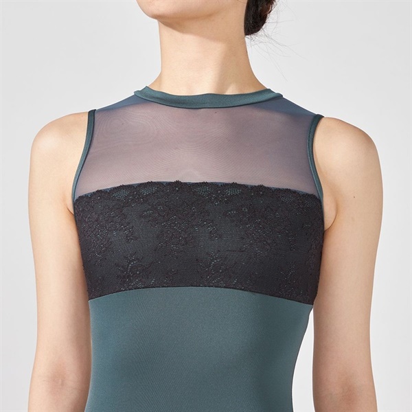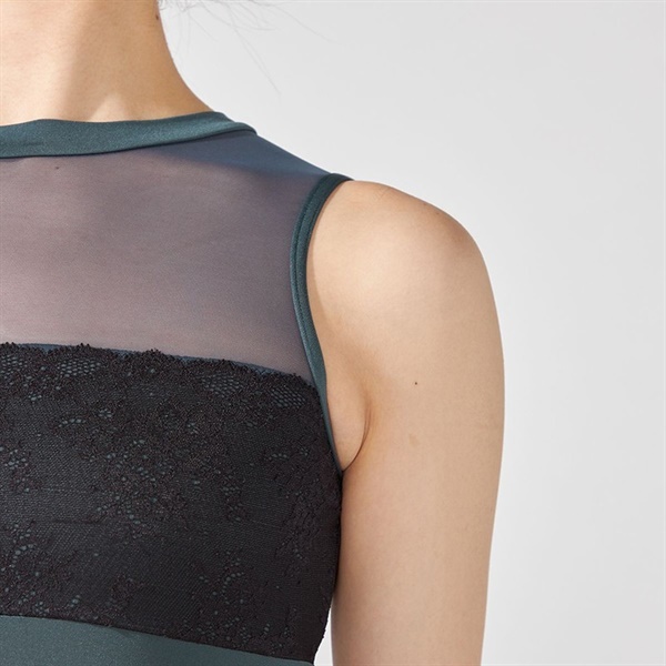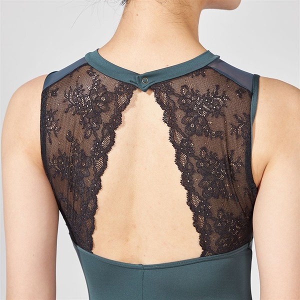 胸元と背中にストレッチレースを切り替えた、洗練された印象のハイネックレオタード