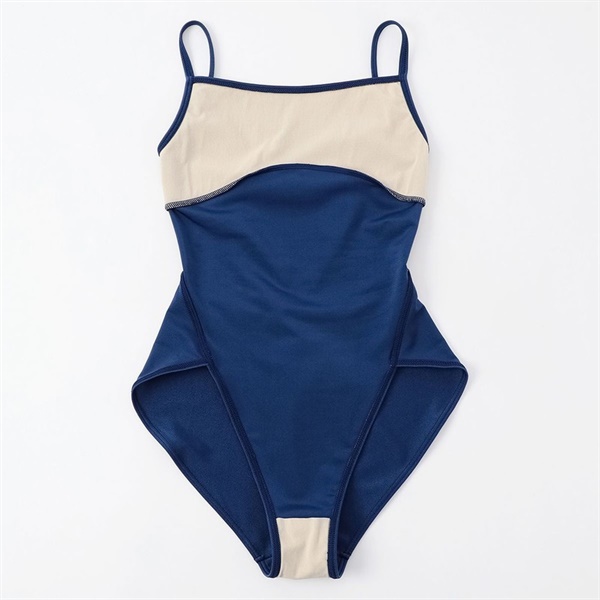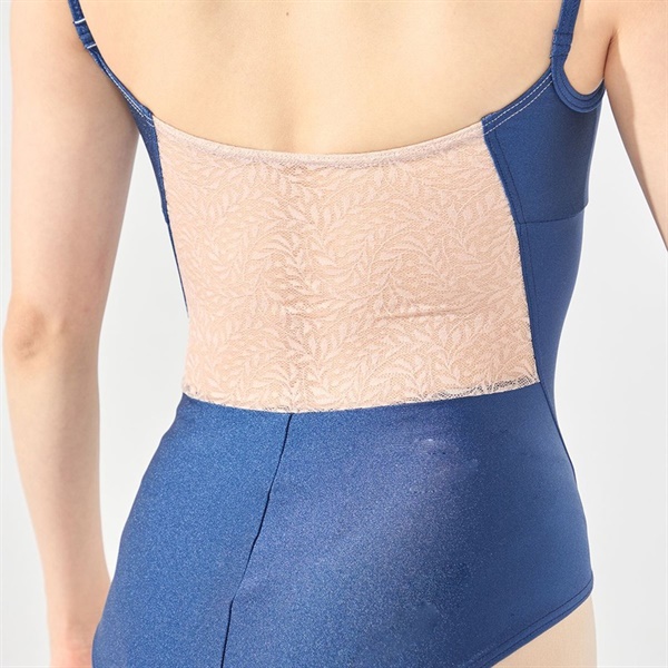 上品な光沢感が美しいインポート素材 Rodi と、繊細なレース柄がモダンな印象のストレッチレースを配色で組み合わせたキャミソールレオタード