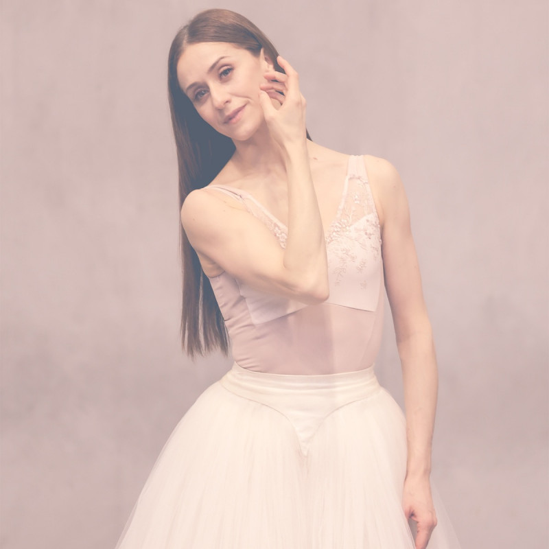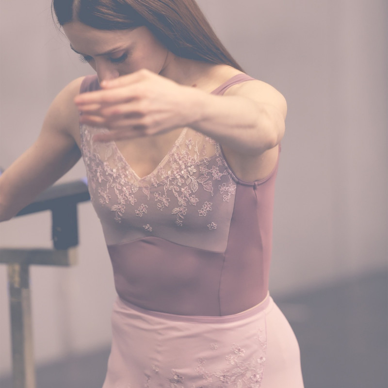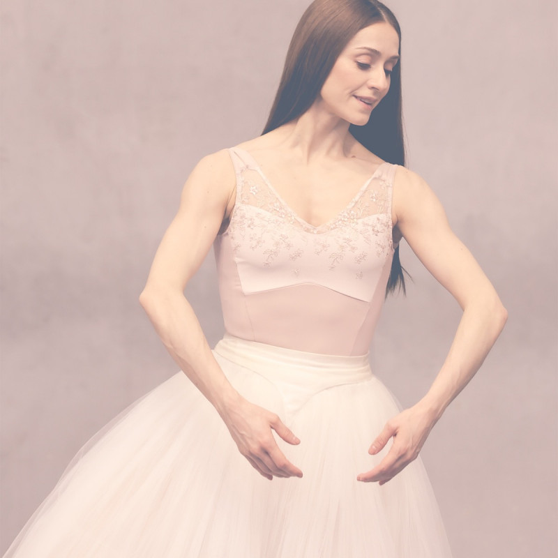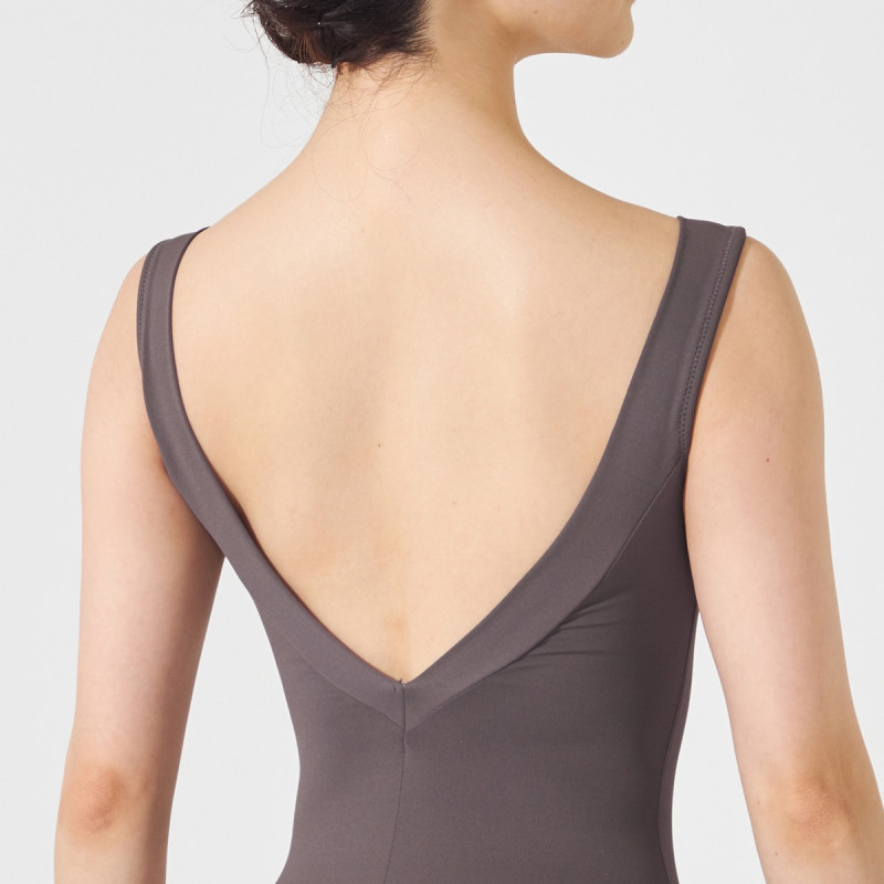 深く開いたVネックが首を長く見せ、美しく開いたデコルテから肩のラインをより美しく見せるノースリーブレオタード