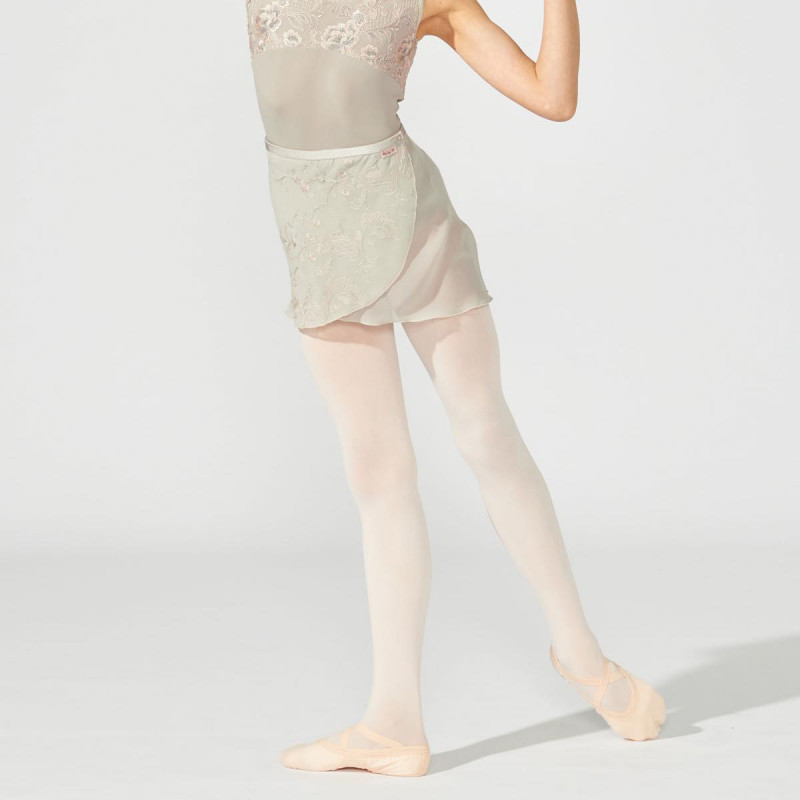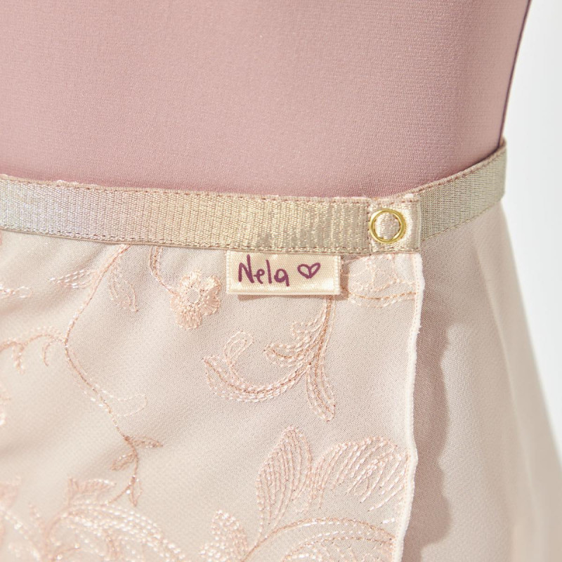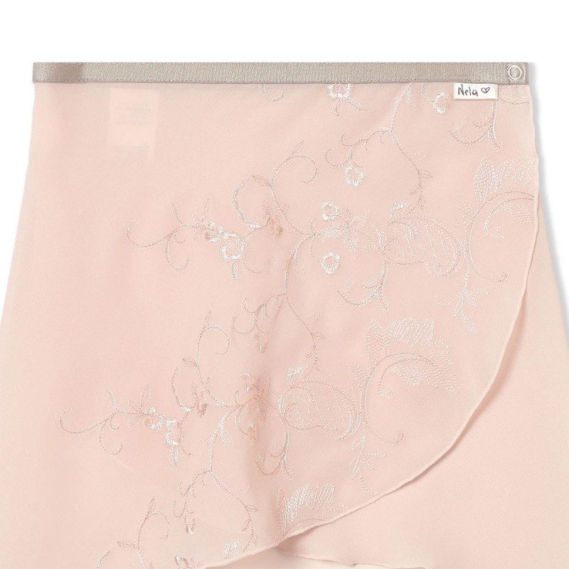 前合わせ部分にボタニカル柄の刺しゅうを施したエンブロイダリーシフォンを使ったスカート