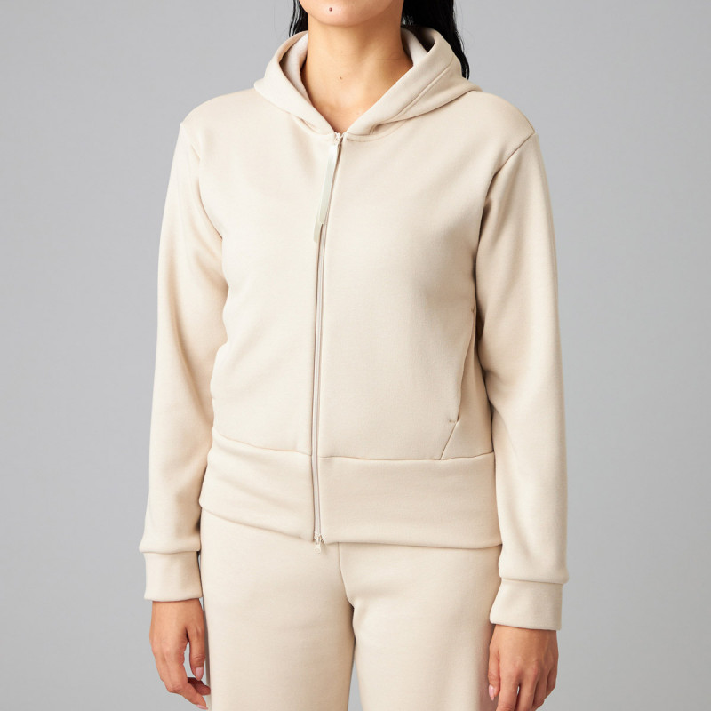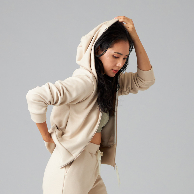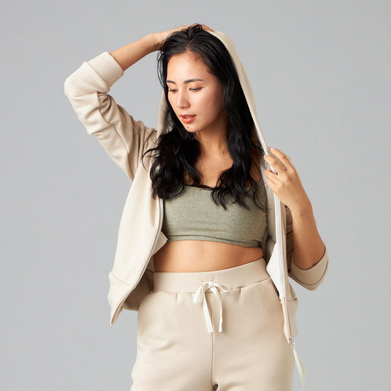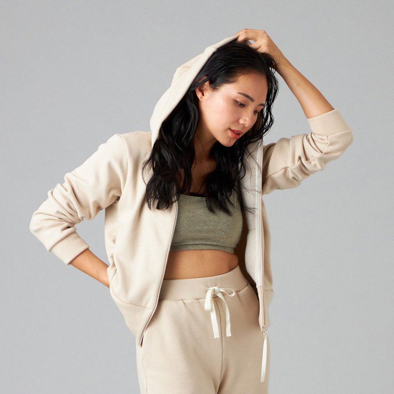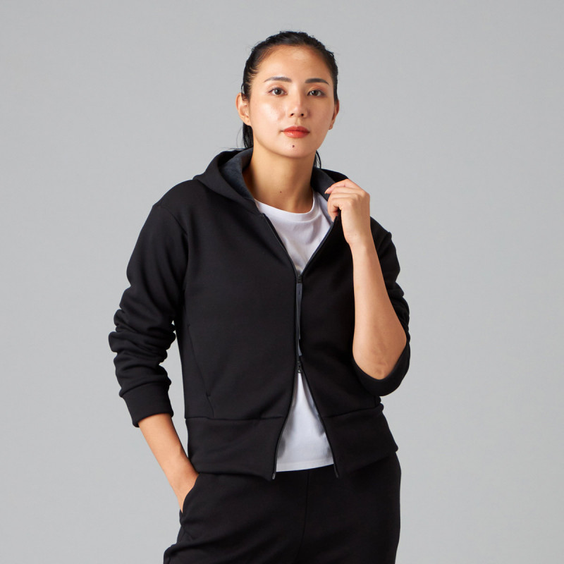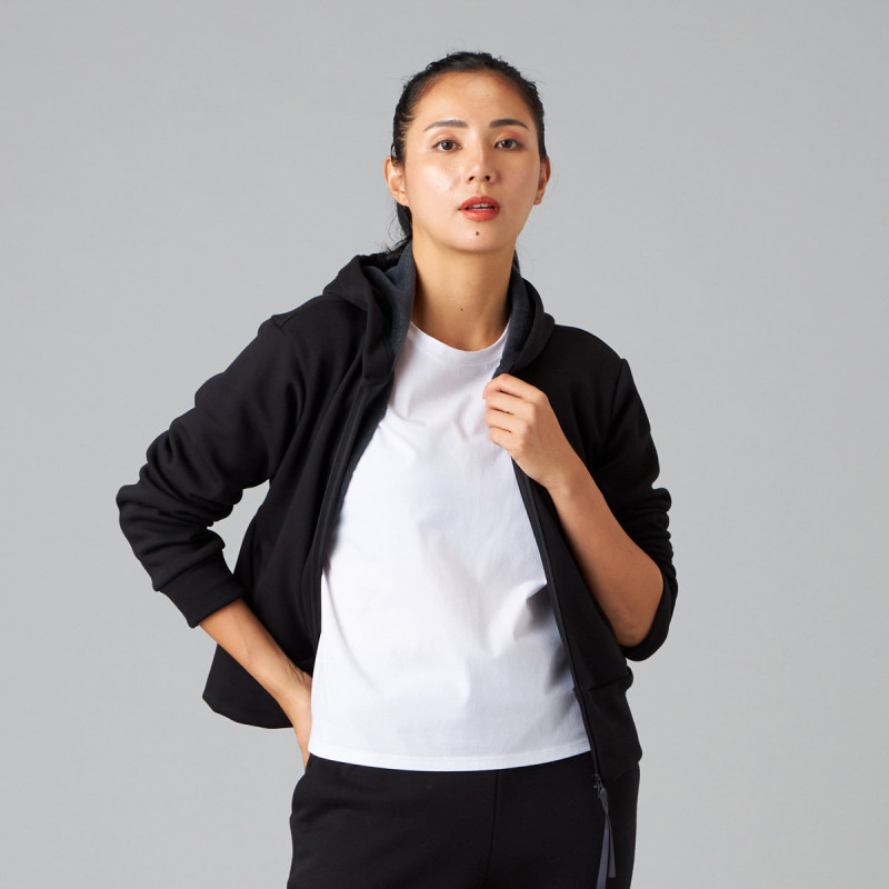 シンプルなデザインでコーディネイトしやすく、レッスン前の羽織として、行き帰りのワンマイルウェアとして便利。