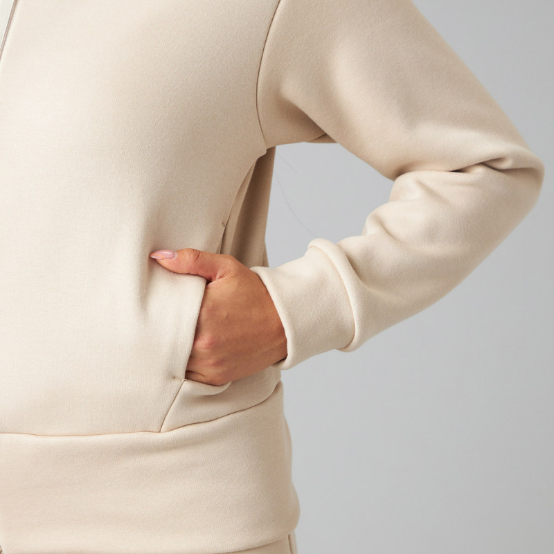 裏側が毛布のような触り心地の裏起毛素材を使用した、温かく優しく包まれるようなジャケット。
