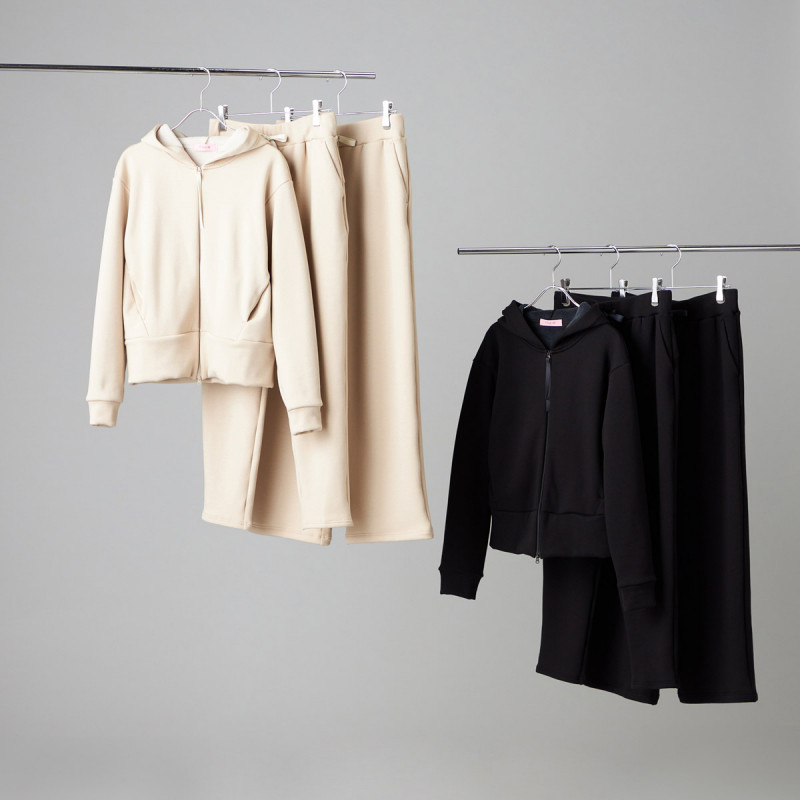 同素材のボトムとのセットアップコーディネイトもおすすめ。