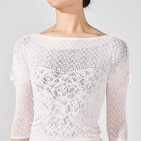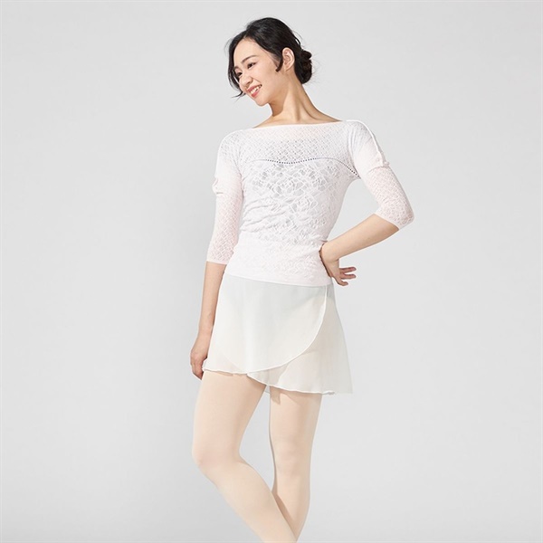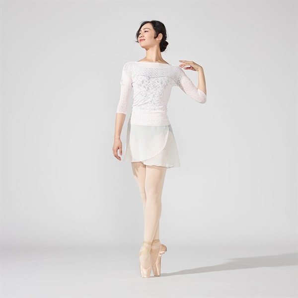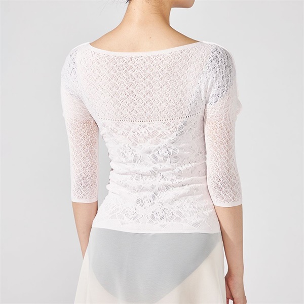 全体的に上品な透け感があり涼しい着心地感で快適にレッスンができるトップ。