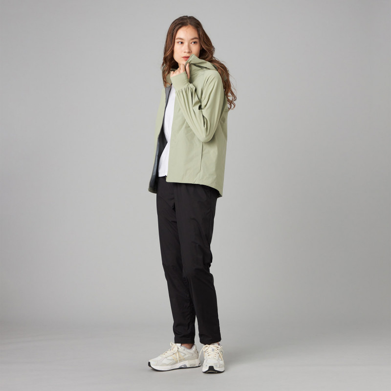 薄手でソフトな風合いのナイロンタフタは軽量で動きの邪魔をせず、撥水機能と透湿性でアクティブウェアにも最適な素材。