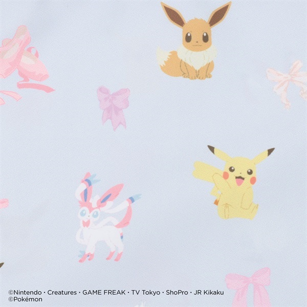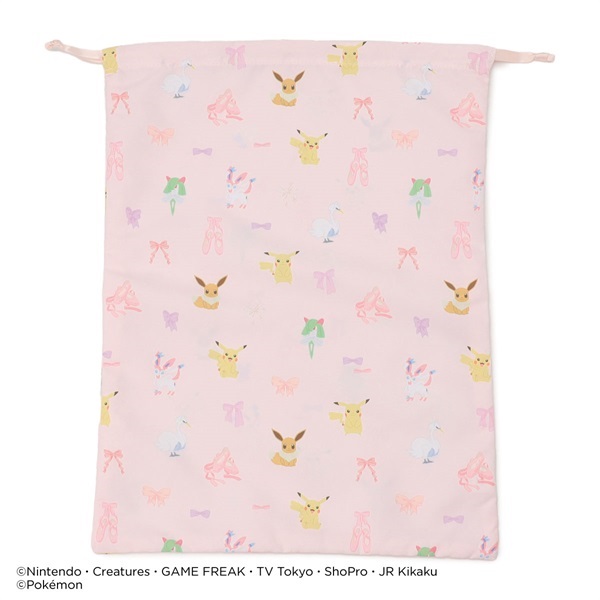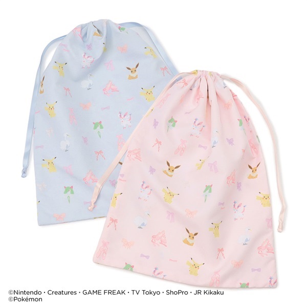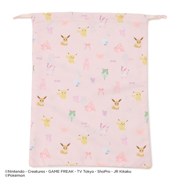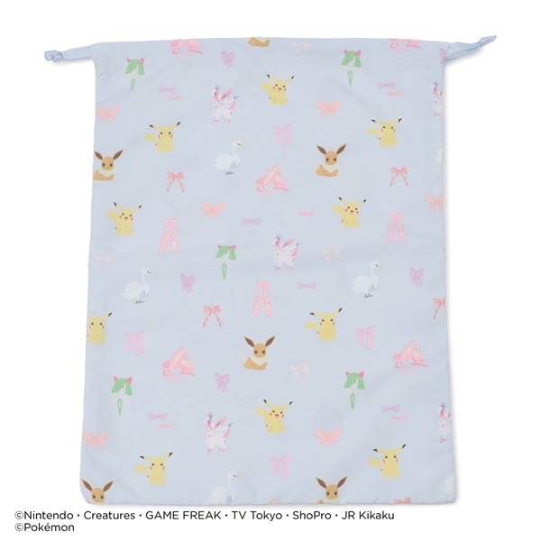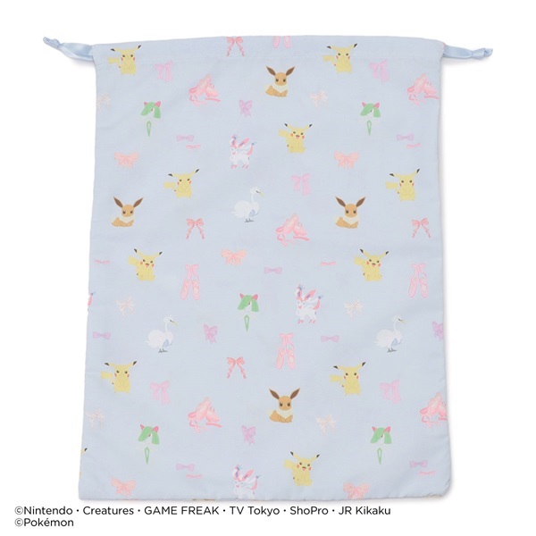 ピカチュウ・ニンフィア・スワンナ・キルリア・イーブイリボン・ポワントが描かれたキュートな総柄巾着Lサイズ。