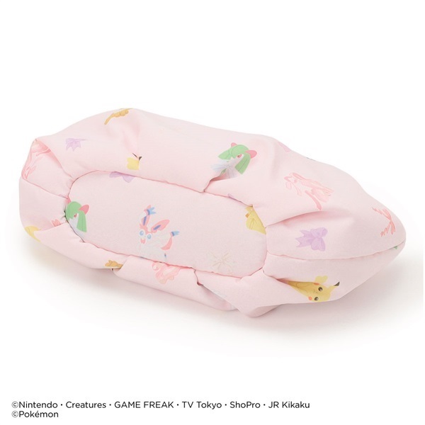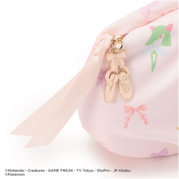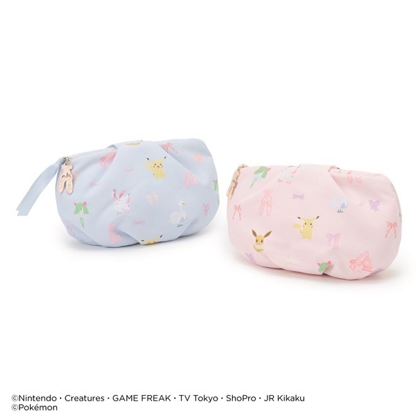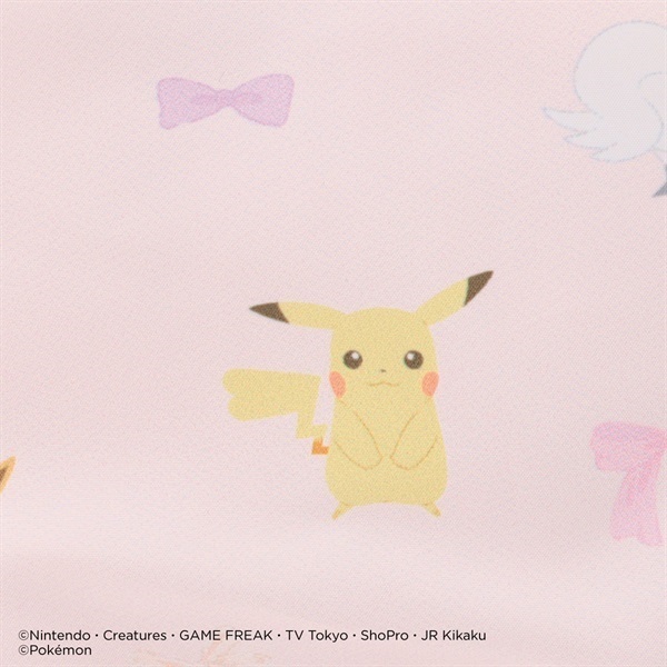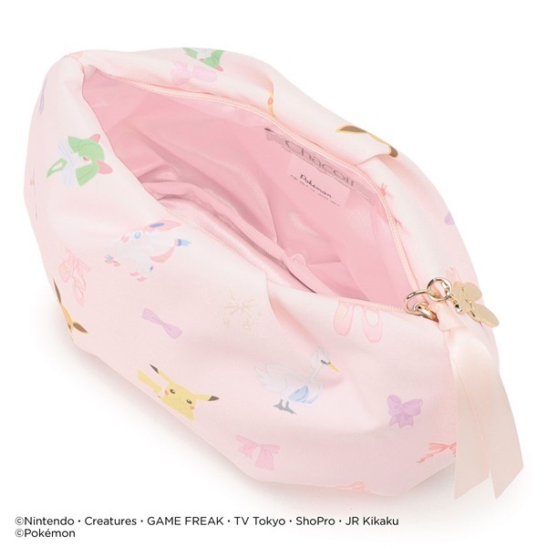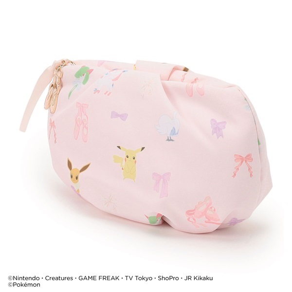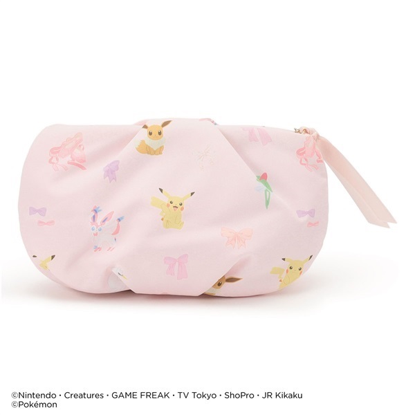 ピカチュウ・ニンフィア・スワンナ・キルリア・イーブイとリボン・ポワントが描かれたキュートな総柄ポーチ。