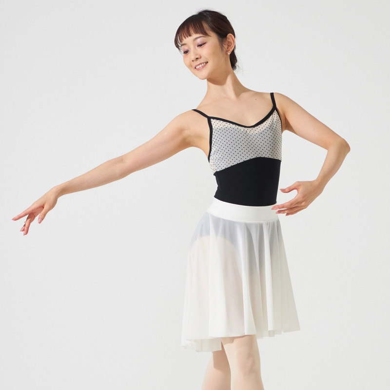ドット柄のフロッキープリントを載せたチュール素材と優れたストレッチ性と着心地の良さが人気のソフトスムースを使用。
