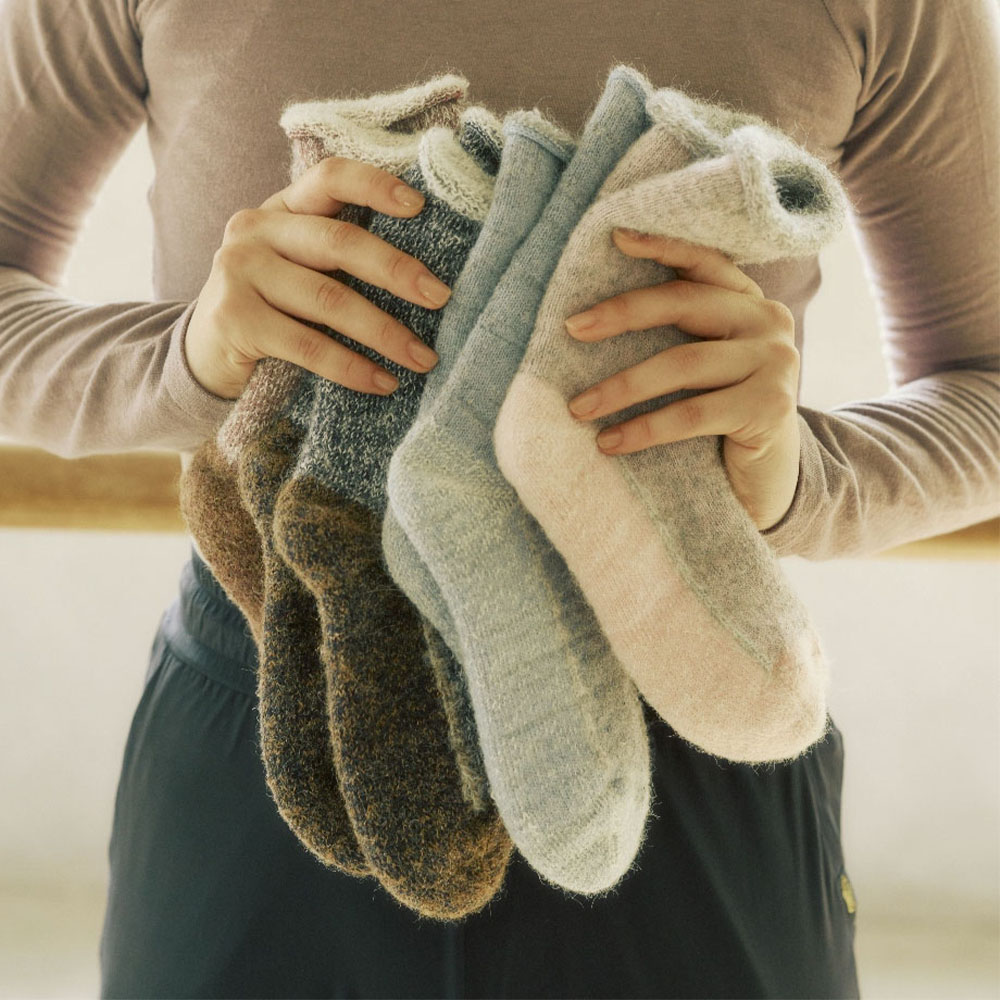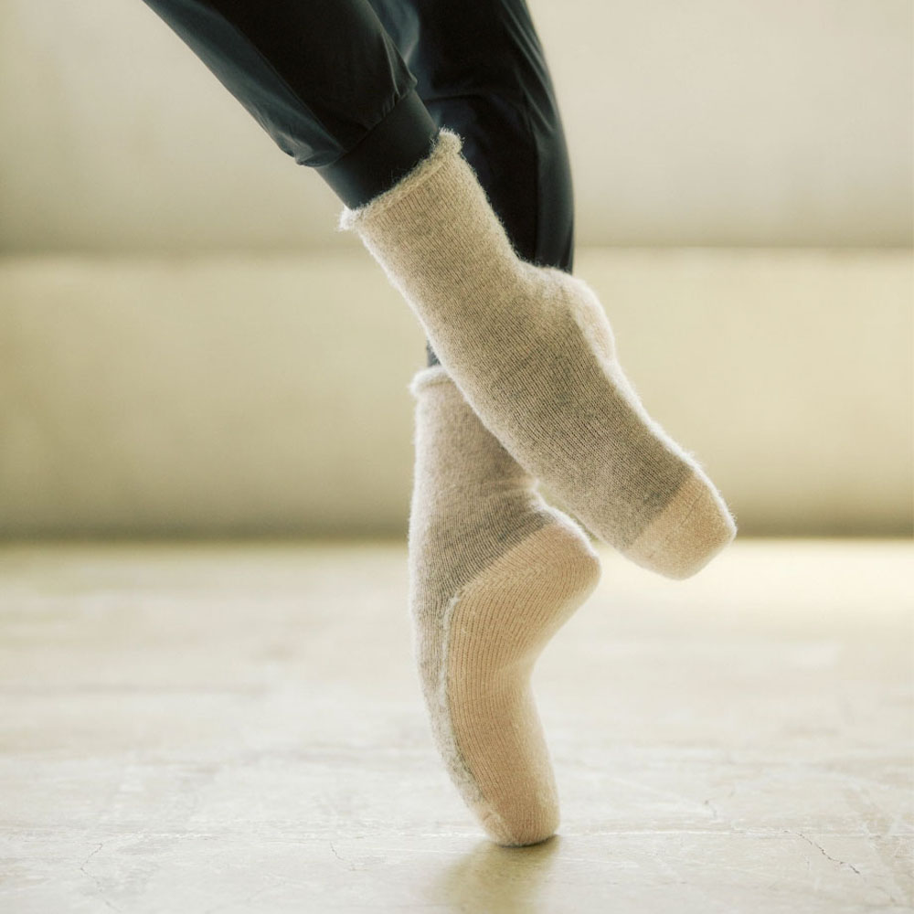 足底に滑り止め加工を施し、素足でのウォームアップもシューズの上からの着用も可能。肌側にアルパカ糸をメインに使用し、パイル編みでたっぷりとしたボリューム感を実現。