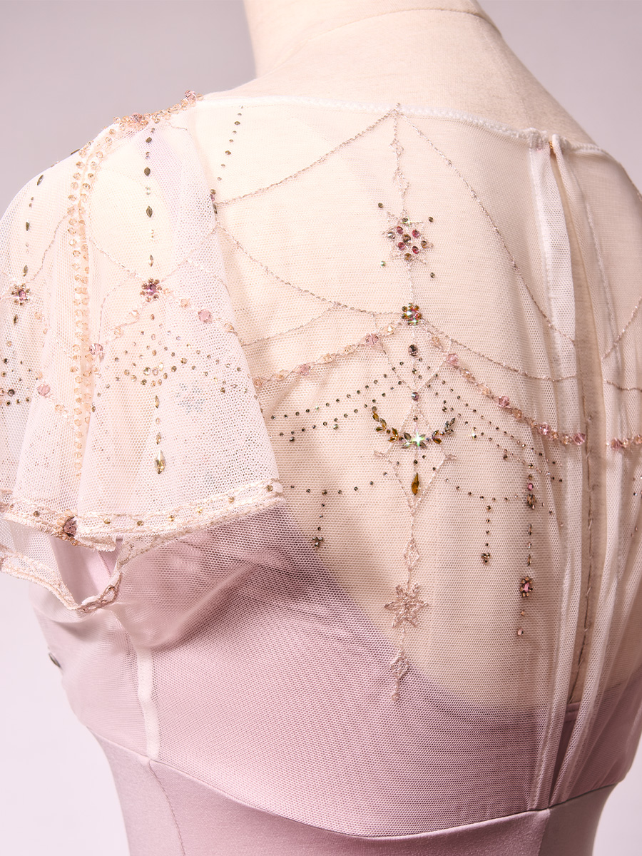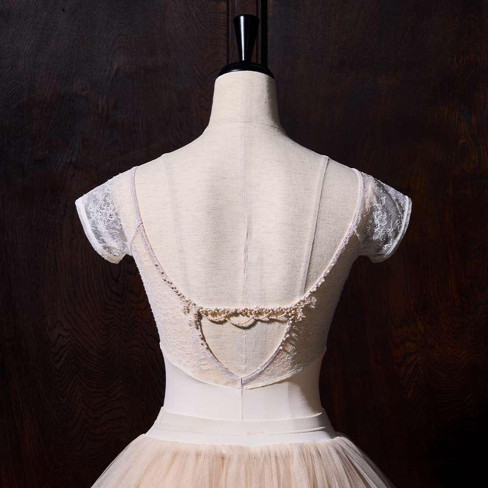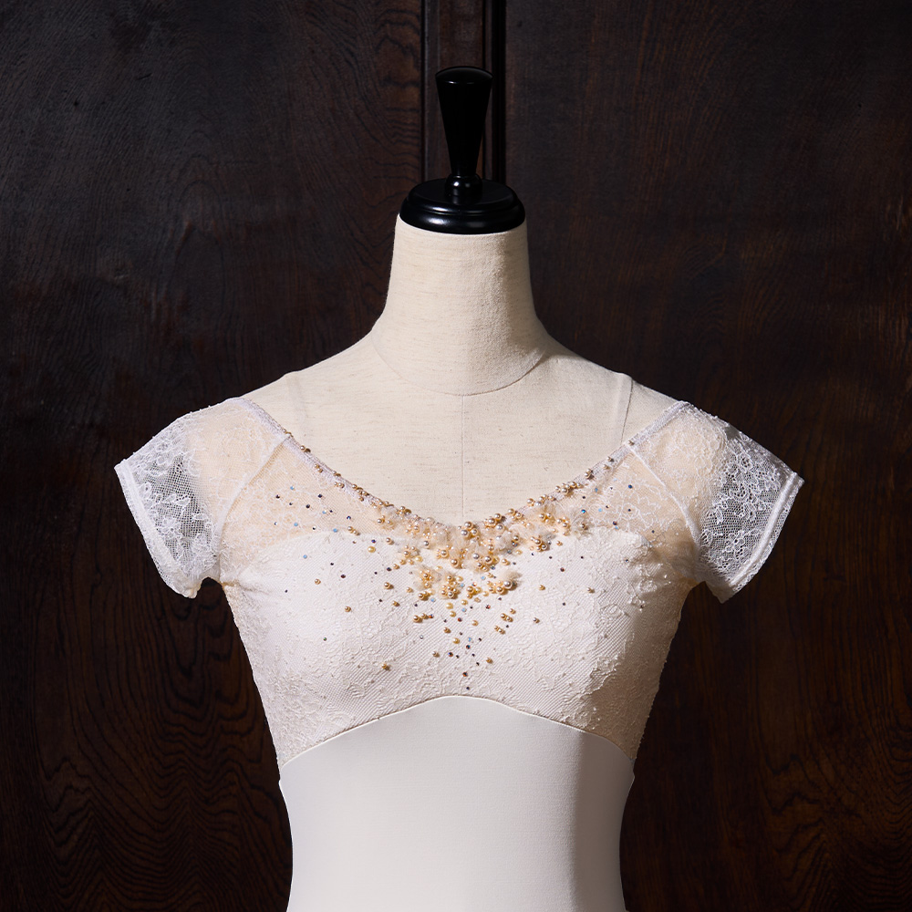 『くるみ割り人形』より金平糖の精をテーマに、実際に『金平糖の踊り』を聴きながらデザインしました。高貴な輝きと繊細できめ細かい音色をイメージし、2000個を超えるクリスタルを使用。それらはすべて熟練の職人が一つひとつ手作業で丁寧に装飾しています。薄手のチュールにこれほど多くのクリスタルを配するには、高度な集中力と技術が必要です。時間をかけて仕上げた唯一無二の一着を、ぜひお楽しみください。