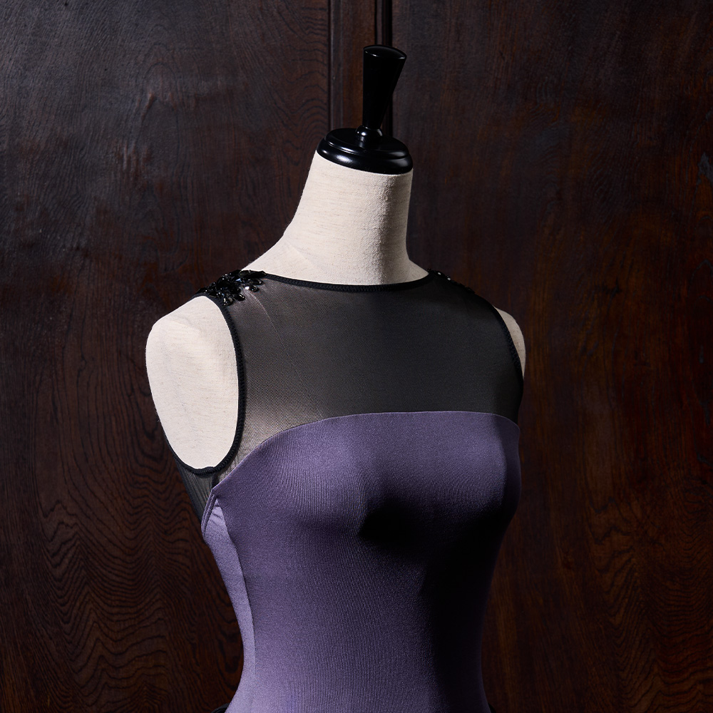 雪の女王のように凛とした女性をイメージし、ブラッククリスタルの鋭い輝きを活かして、強く現代的な雰囲気に仕上げました。手に取ったときに感じるクリスタルのずっしりとした重みとは裏腹に、驚くほど軽やかな着心地のレオタードです。