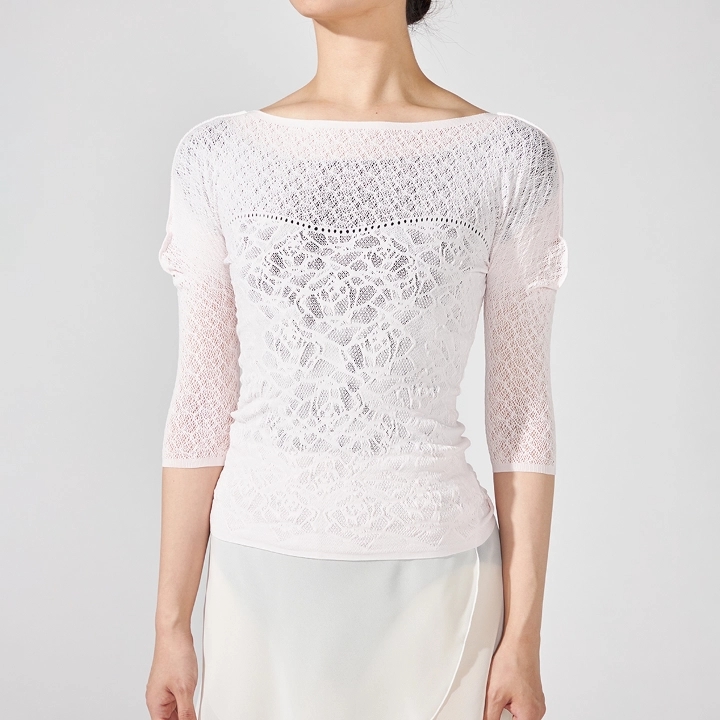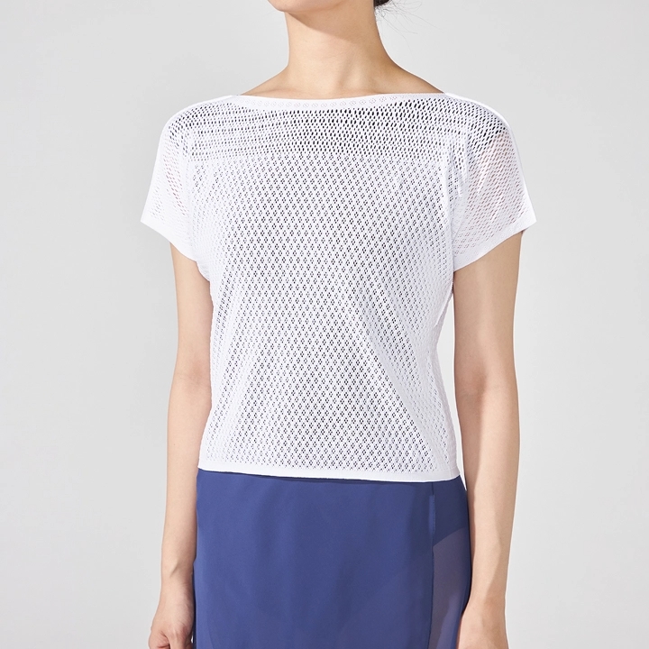 上品な透け感と涼しい着心地で、レッスン中も快適なトップス。コーディネートしやすい着丈と、デコルテを美しく見せるラインがポイントで、軽量コンパクト&二の腕~ヒジ周りをカバーする6分袖です。