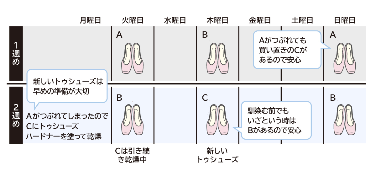 発表会前やレッスン回数が増えると湿気もたまりやすくなるため、急にトゥシューズがつぶれてうまく踊れなくなってしまうこともよくあります。
