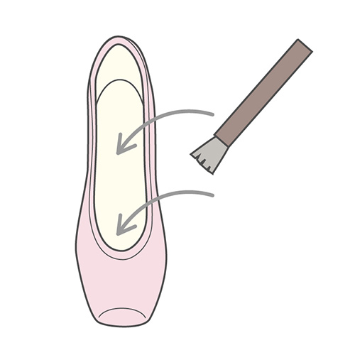 トゥシューズハードナーをインソールやボックスの内側に塗ることで湿気から守ることができ、強度がアップします。