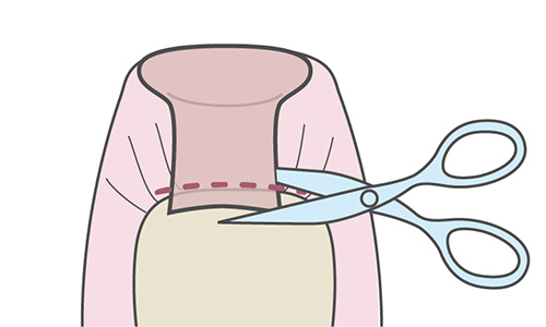 トゥシューズのつま先部分に合ったサイズのポワントパッドを選びます。つま先部分に形を合わせ、はみ出した部分は切り取ります。