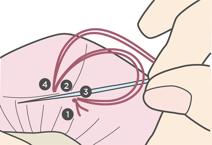 【4】から出た針を【2】と【3】の糸の間に通します。