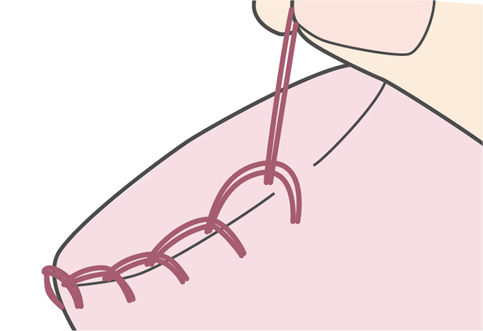 糸を引っ掛けるようにトゥ先部分のふちを縫っていきます。1周したら玉止めします。